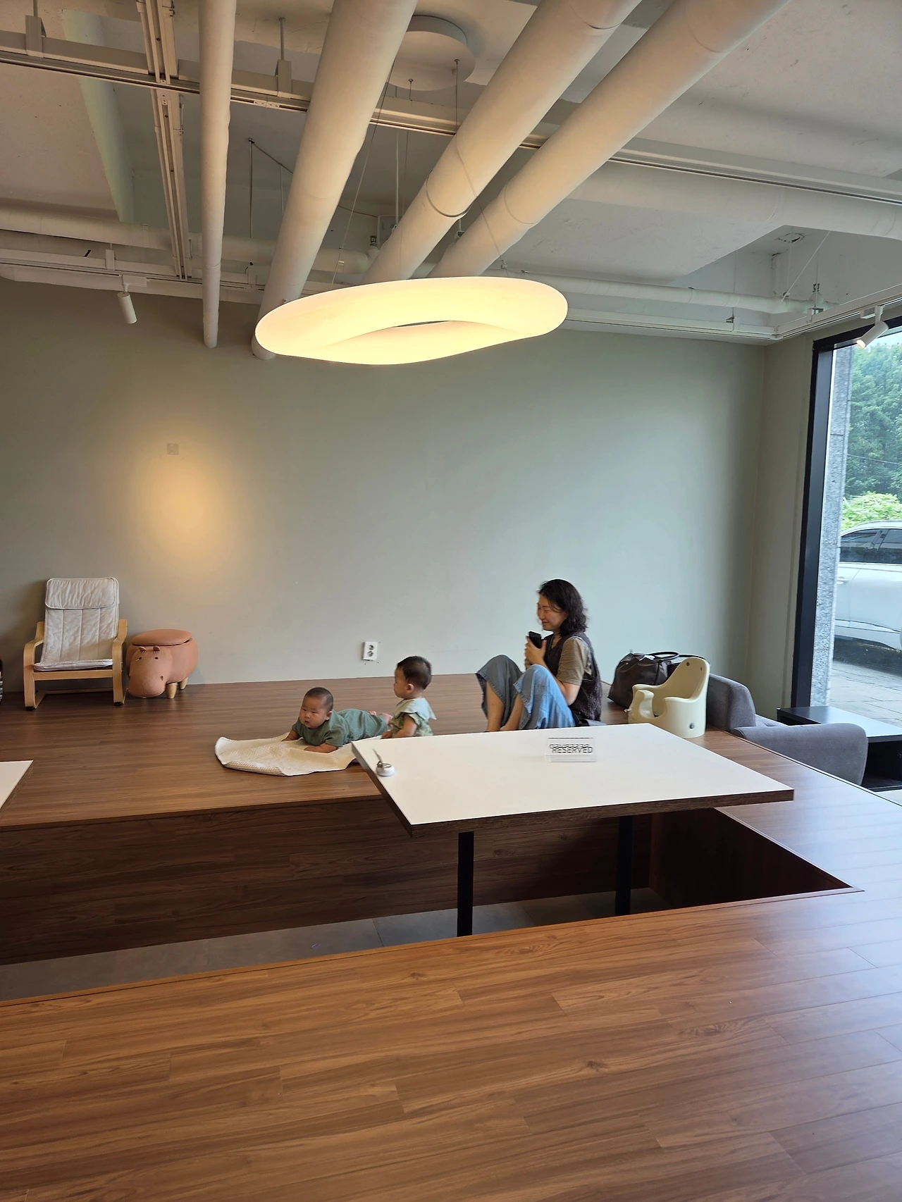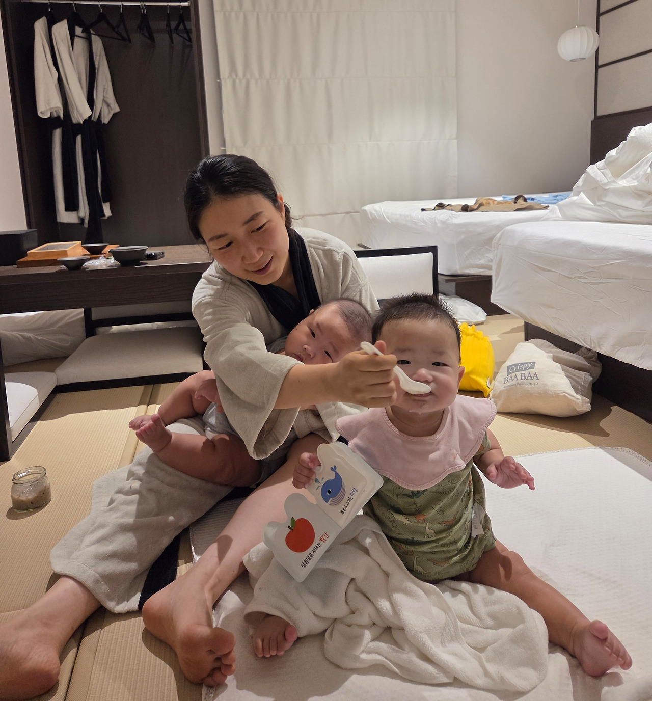 지난 금요일과 토요일 1박 2일로 콩떡이네와 호캉스 다녀왔다. 나, 양갱이, 덕이(콩떡이 엄마), 콩떡이 이렇게 넷이서 보낸 아빠 없는 외박이다. 아빠 없는 호캉스는 육캉스라고 하던데, 어차피 우리 둘은 육아에 있어서 아빠 의존도가 높진 않았기에 생각보다 할만했다. 정신적 피로도도 낮았다. 남편과 함께 있으면, 한 마디 정도는 싫은 소리 하게 된다. 과거, 현재, 미래를 관통하는 고민을 나누면 괜한 스트레스를 받기도 한다. 그에 반해, 덕이랑은 사소한 남편 뒷담화나 가벼운 육아 정보 나누는 정도에서 끝내니 훨씬 힐링 느낌이다. 아빠들이 없으니 우리 둘은 최소한의 동선을 계산하고 효율성을 최대화하느라 애썼지만, 꽤 잘 해냈다. 양갱이와 콩떡이가 순한 덕분이기도 하고 우리 둘의 육아 자신감은 한 사람이 둘을 보는 것도 거뜬할 만큼 높아져 있었다.