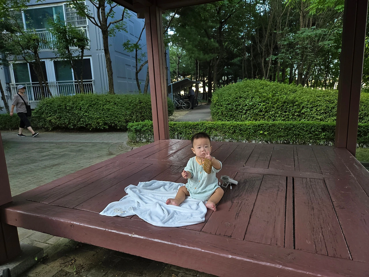 오후 날씨가 더워지면서 새벽에 정자에서 시간을 보내기 시작했다. 천기저귀 한두 개와 장난감, 정자에 깔 큰 수건을 들고나간다. 정자에 우두커니 앉아 있다 보면 늘 만나던 사람들이 지나간다. 홀로 산책하는 사람부터 노부부, 한 가족, 강아지 산책, 캣맘, 아침예배 등 다양하다. 양갱이는 지나가는 사람들을 뚫어져라 쳐다본다. 심지어 몸을 틀어서까지 지나가는 내내 지켜본다. 작은 아기가 뚫어져라 보니 그냥 지나치기 어려워 발길을 돌려 우리 쪽으로 온다. 이렇게 한 사람 한 사람에게 인사하며 지내다 보니, 지난 2달 동안 많은 분들과 양갱이 커가는 모습을 나누었다. 그분들도 아침에 나올 때마다 양갱이와 함께 시작할 아침을 기대하면서 나온단다. 그들끼리 ‘오늘도 정자에 애기 나왔어요?’ ‘아직 정자에 애기 있어요?‘ 라며 양갱이 status를 공유한다. 덕분에 양갱이는 낯가림 없는 아기가 되었다. 낯가림이 없으니 더 이뻐라 해주신다. 선순환이다. 덤으로 동네 개들 이름도 많이 알게 됐다. ‘댕댕이, 콩이, 코코, 링고, 블랙, 여름이, 보리… ’