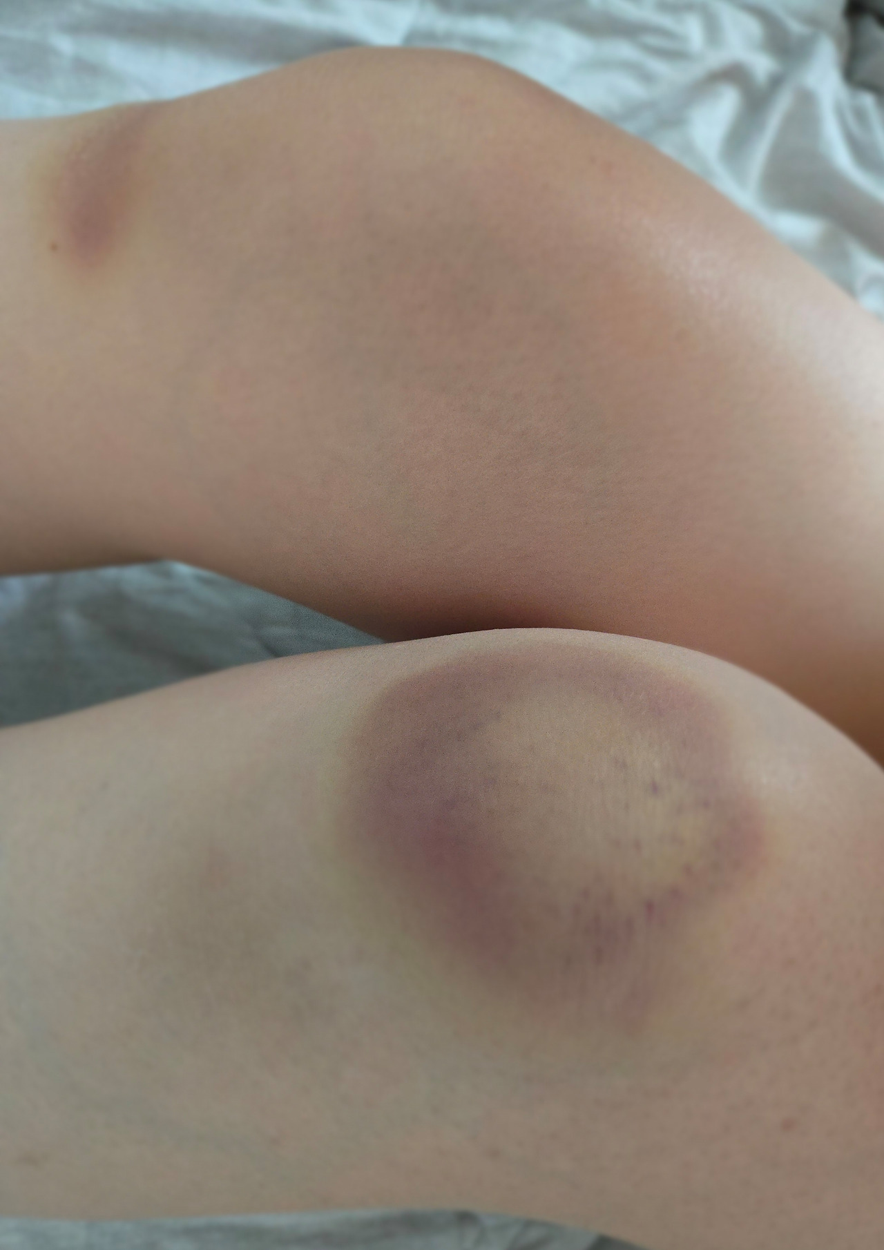 양갱이는 놀라서 울고 나는 무릎이 얼얼해 일어나질 못했다. 내 비명소리와 양갱이 울음소리에 남편이 자다 깼다. 다행히 양갱이는 아빠가 안아주니 금방 배시시 웃었다. 무릎이 욱신거렸지만 그래봤자 멍이겠지 싶어 확인도 안 했는데 시퍼렇다.
