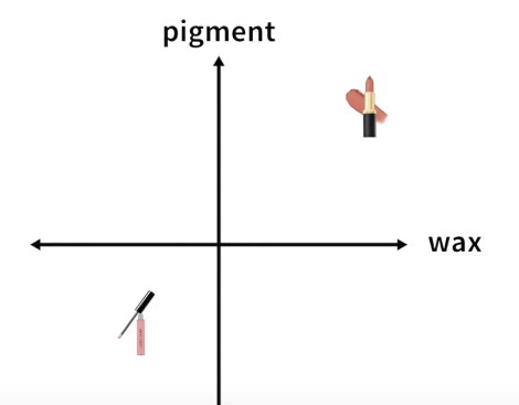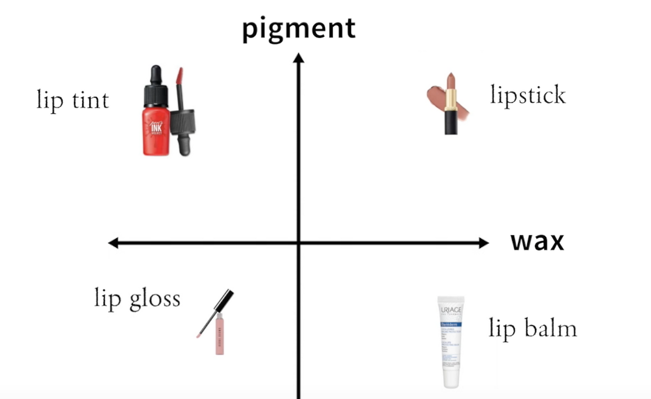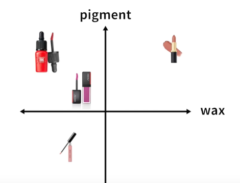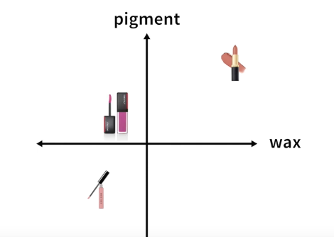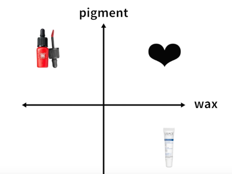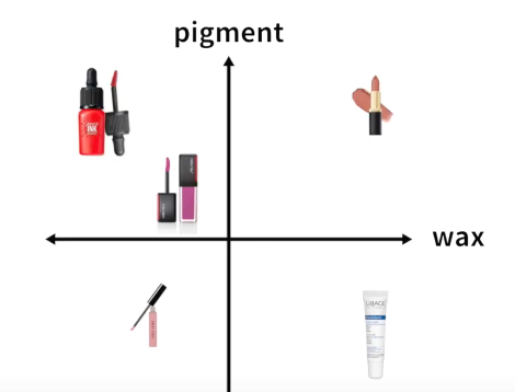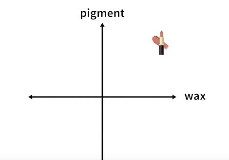 x축은 왁스, y축은 색소 의 함량으로 보면 립스틱은 왁스도 많고 색소도 많이 포함되어 있어 바로 위와 같은 위치에 존재하게 됩니다. 색소가 많이 포함되어 있기 때문에 뛰어난 발색과 지속력을 특징으로 하게 됩니다.
