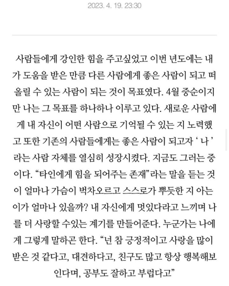 4월 19일의 나는 이런 감정과 생각을 했었구나. 4월의 나를 다시 마주하니 참 뿌듯하기도 쑥스럽기도 하다. 벌써 2023년의 반틈이 지나갔다. 2023년의 상반기의 나는 “두려움”, ”용기“, ”강인함 “ 인 것 같다. 항상 무슨 선택이든 신중했고, 걱정도 많았던 예전의 나는 두려움에 마주 앉아 아무것도 못했다. 하지만 확실치 않는 미래에 용기를 가지고 혼자 해보고 누군가에게 도움도 받으며 하나둘씩 배워가며 경험을 차곡차곡 쌓아갔다. 한 번 용기를 가져보니 어떠한 일이든 해낼 수 있는 자신감도 생겼다. 돌이키고 보니 “완벽을 추구하는 것보다 일단 해내는 것이 중요하다 “라는 말이 참 와닿았다.