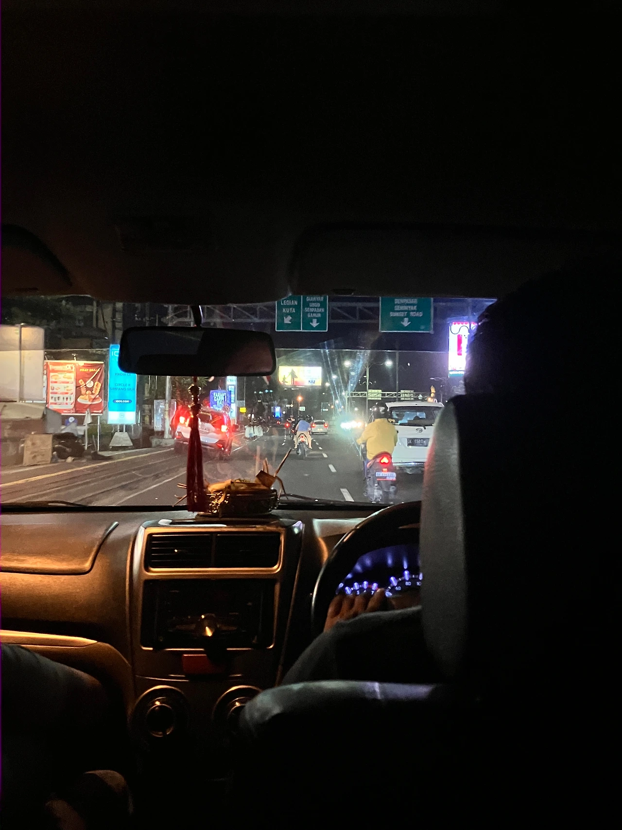 밤 11시, 우붓(숙소)까지는 차로 2시간 거리. 후다닥 입국심사를 마치고 미리 예약한 그랩을 탔다. 기사님과 아내 그리고 따님께서 친절하게 맞이해 주셨다. 어둡고 익숙하지 않은 길에 걱정도 됐지만, 기사님과 가족과의 짧은 대화로 긴장도 풀리고 밖으로 스치는 조형물들과 불빛들을 보며 인도네시아의 밤을 눈으로 담았다.