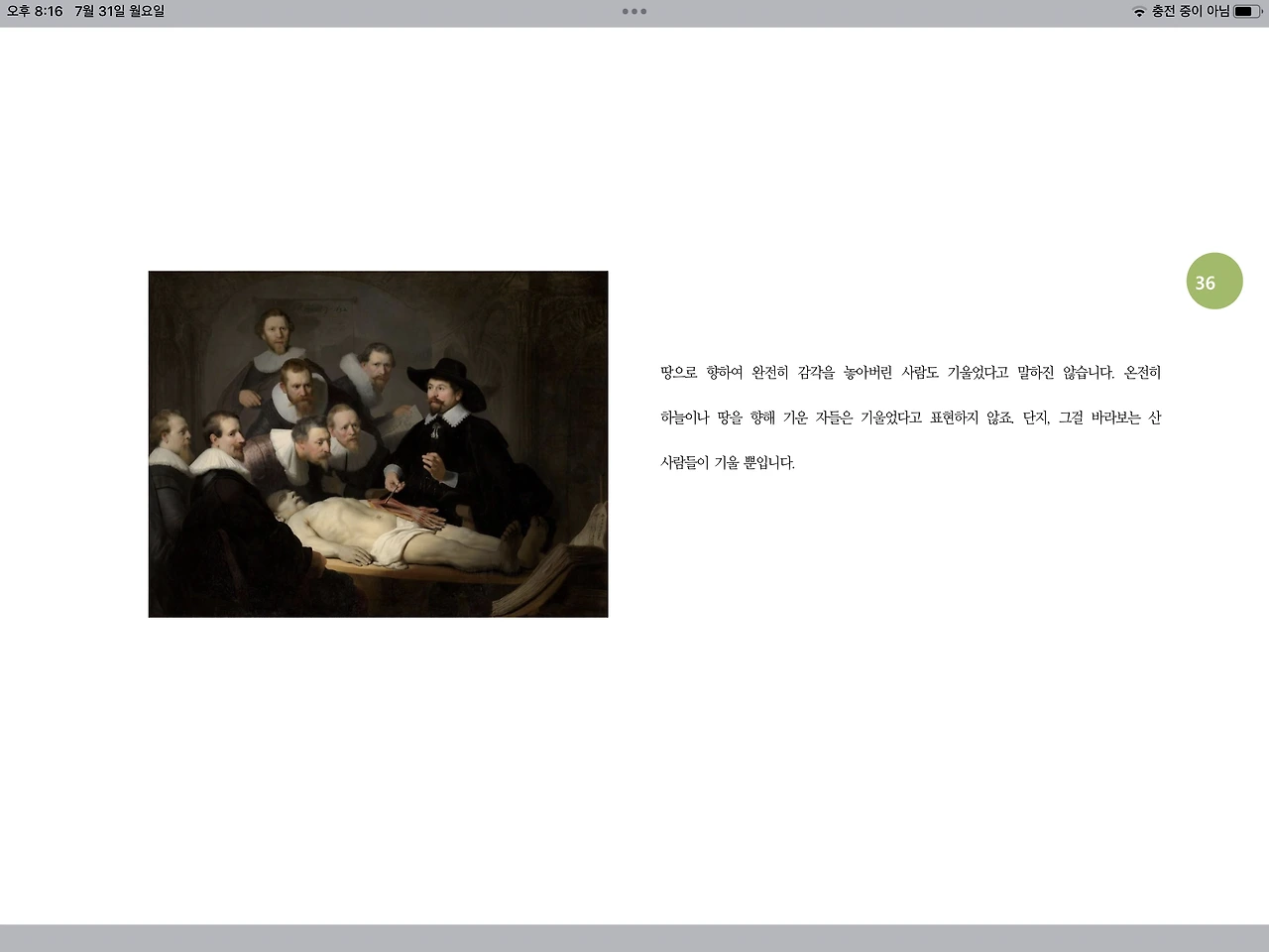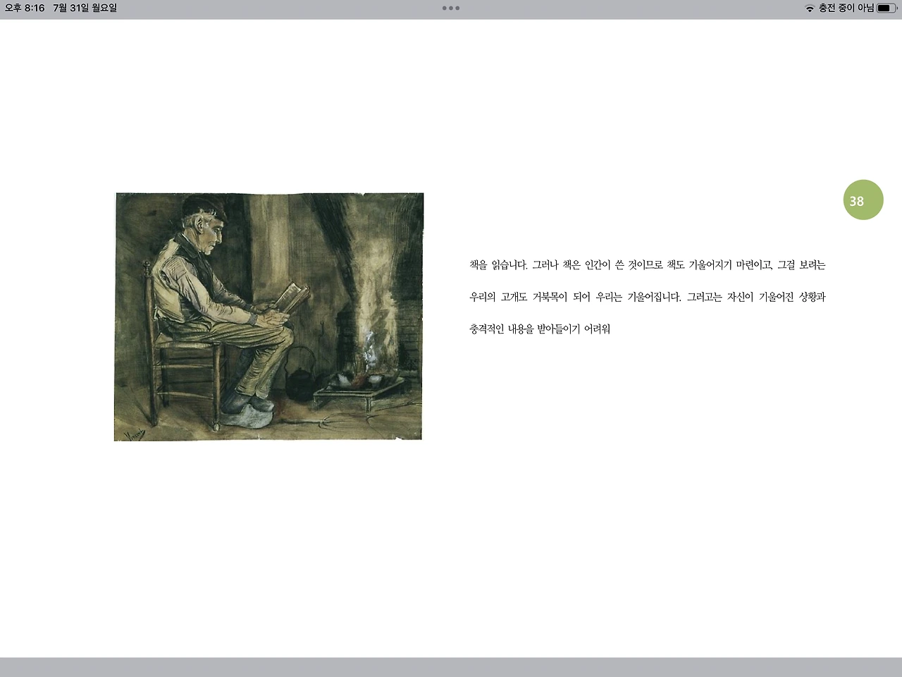 책을 읽습니다. 그러나 책은 인간이 쓴 것이므로 책도 기울어지기 마련이고, 그걸 보려는 우리의 고개도 거북목이 되어 우리는 기울어집니다. 그러고는 자신이 기울어진 상황과 충격적인 내용을 받아들이기 어려워