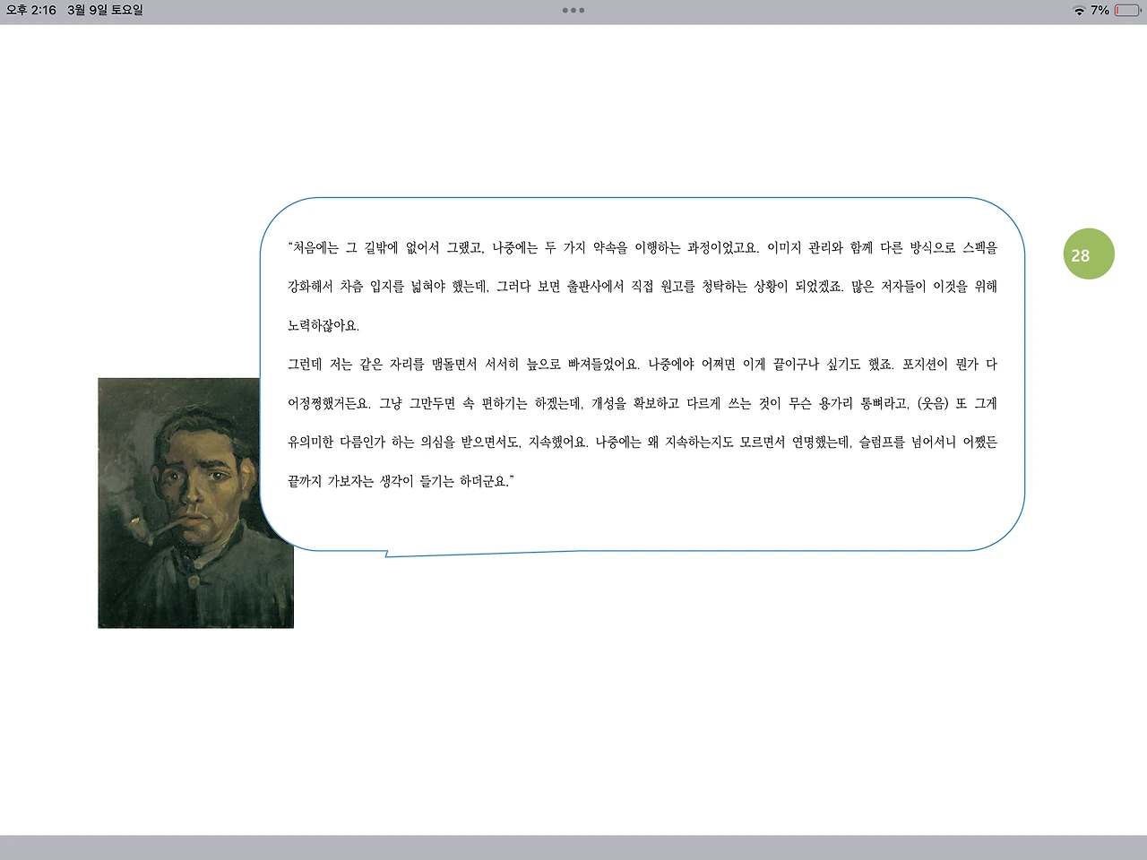 - 매거진 방식으로 작성하였습니다. 물론 실제로 다양한 저자를 섭외하지는 않고 단독으로 작업하였습니다. 매거진에서 다양한 글에 다양한 필자가 있기 마련인데, 여기서는 다중 정체성의 다른 인물을 연기하는 것처럼 고흐 이미지를 배치하고 여러 스타일의 글과 함께 구성하였습니다. 픽션 매거진이라고도 할 수 있으며 매거진 놀이로도 부를 수 있을 텐데, 이 원고의 경우 전체 흐름에선 사실과 경험을 토대로 하되 종종 일관된 방향성을 띠되 원활한 개진을 위하여 허구적 설정을 삽입하였습니다. 대체로 경험적 정보로 이해하셔도 무방합니다.