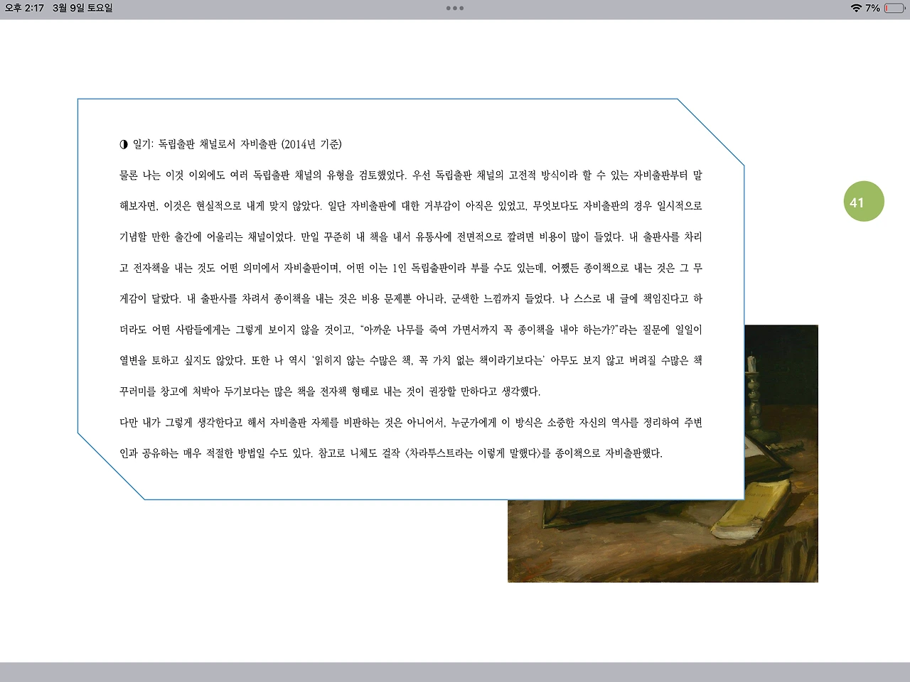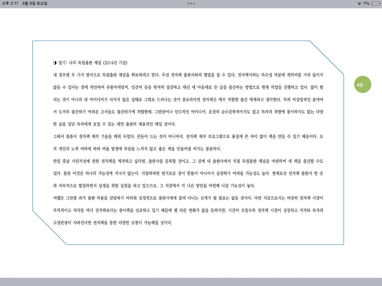 그래서 틈틈이 전자책 제작 기술을 배워 두었다. 큰돈이 드는 것이 아니어서, 전자책 제작 프로그램으로 품질에 큰 차이 없이 책을 만들 수 있기 때문이다. 오직 개인의 노력 여하에 따라 비용 발생에 부담을 느끼지 않고 좋은 책을 만들어낼 여지는 충분하다.