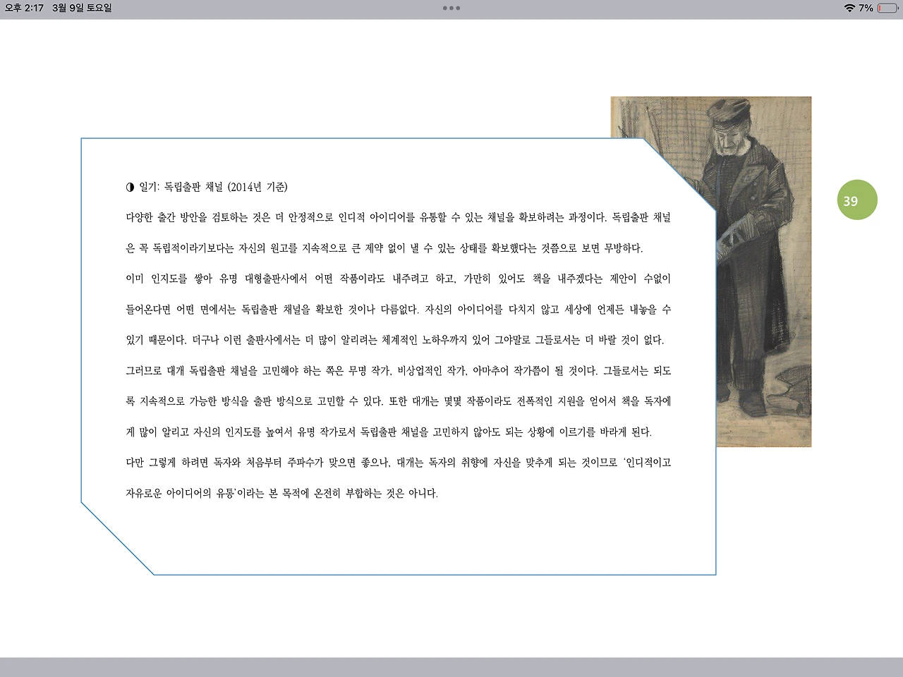 내 경우엔 두 가지 방식으로 독립출판 채널을 확보하려고 한다. 우선 전자책 출판사와의 협업을 들 수 있다. 전자책이라는 특수성 덕분에 제작비를 거의 들이지 않을 수 있다는 점에 착안하여 유통마케팅비, 인건비 등을 현저히 절감하고 대신 내 마음대로 쓴 글을 출간하는 방법으로 현재 작업을 진행하고 있다. 많이 팔리는 것이 아니라 내 아이디어가 다치지 않은 상태로 그대로 드러나는 것이 중요하다면 전자책은 매우 적합한 출간 매체라고 생각한다. 특히 비상업적인 분야여서 도저히 출간하기 어려운 고서들도 출간하기에 적합한데, 그만큼이나 인디적인 아이디어, 온전히 순수문학적이지도 않고 독자의 취향에 봉사하지도 않는 다양한 글을 일단 독자에게 보일 수 있는 대안 출판의 대표적인 예일 것이다.