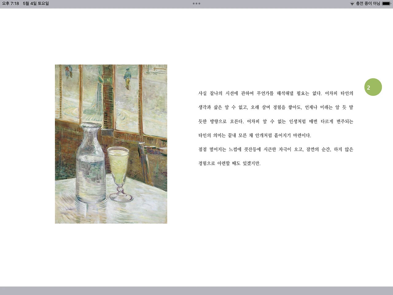 “그 모호한 감정은 지평선 어딘가로 쉴 새 없이 은은하게 번졌어요. 빛은 하나의 선처럼, 새벽의 어두운 공간으로 번지면서 차츰 정체를 드러냈죠. 밤잠을 설치고는 그 광경을 지켜보던 사람들의 고단한 미소처럼요. 빛이 퍼져서 묵묵히 서 있던 나무에 드리워지던 오래된 그림자처럼요.”