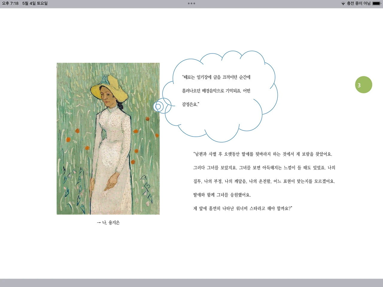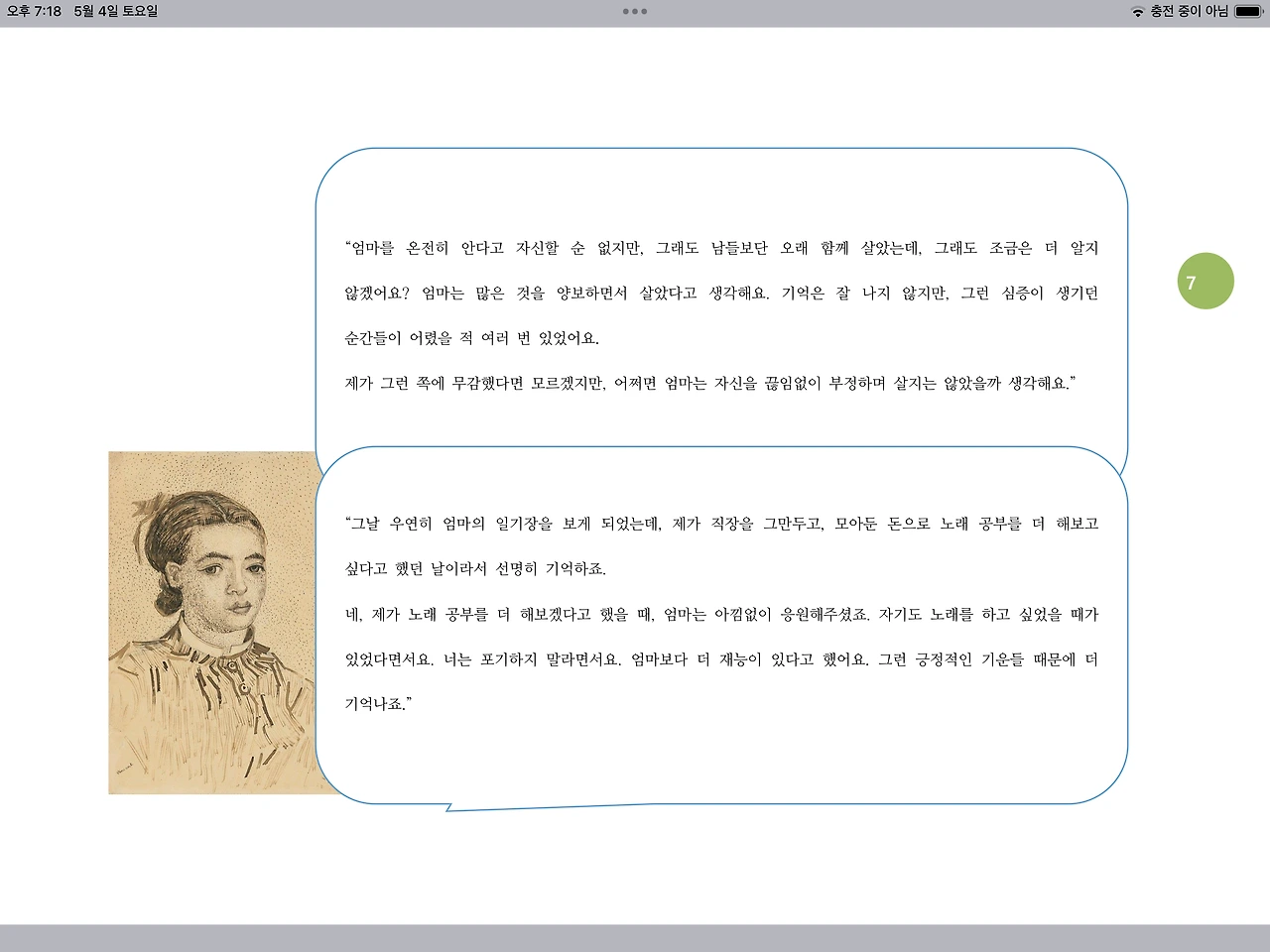 “엄마를 온전히 안다고 자신할 순 없지만, 그래도 남들보단 오래 함께 살았는데, 그래도 조금은 더 알지 않겠어요? 엄마는 많은 것을 양보하면서 살았다고 생각해요. 기억은 잘 나지 않지만, 그런 심증이 생기던 순간들이 어렸을 적 여러 번 있었어요.