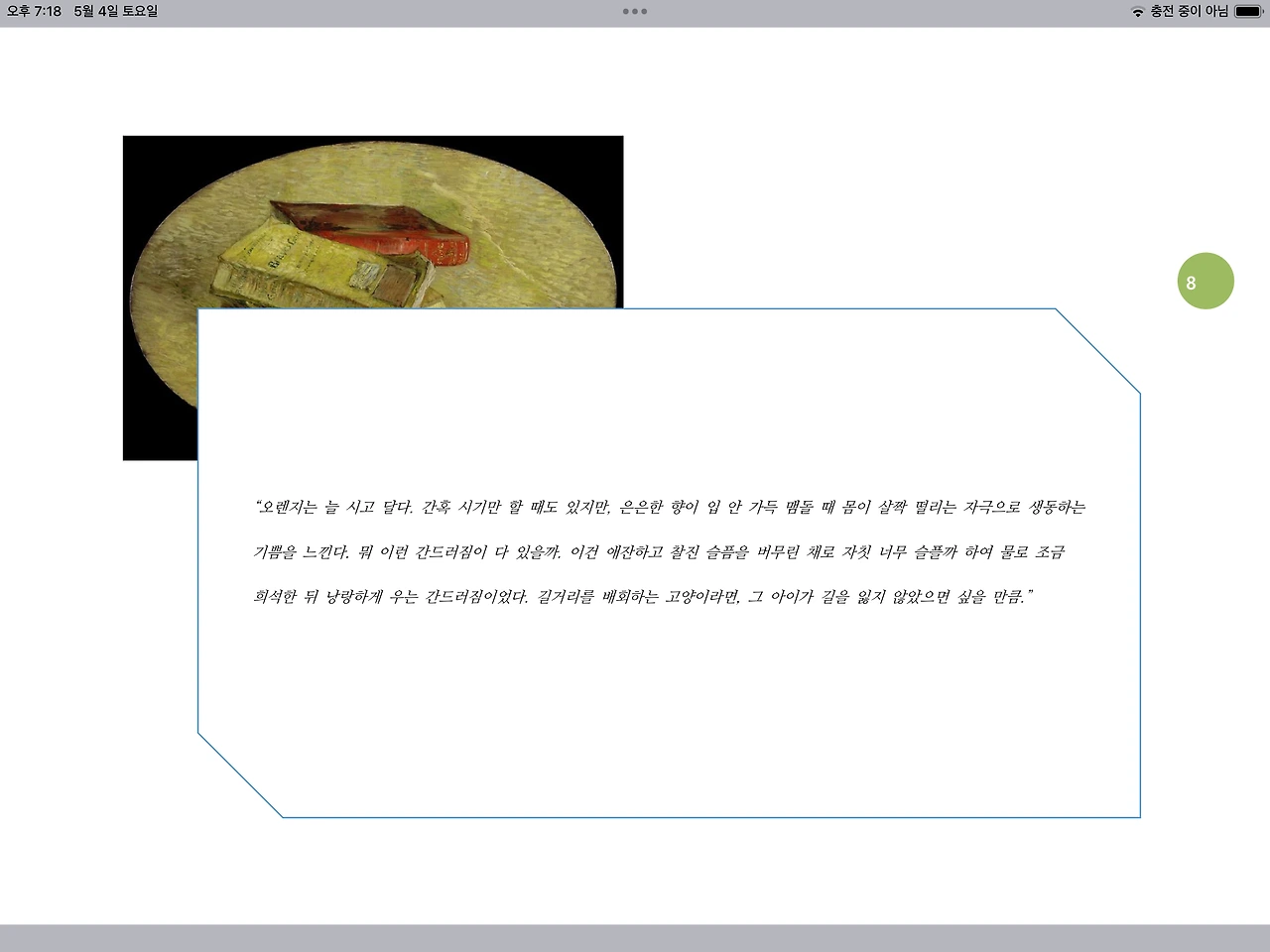 “오렌지는 늘 시고 달다. 간혹 시기만 할 때도 있지만, 은은한 향이 입 안 가득 맴돌 때 몸이 살짝 떨리는 자극으로 생동하는 기쁨을 느낀다. 뭐 이런 간드러짐이 다 있을까. 이건 애잔하고 찰진 슬픔을 버무린 채로 자칫 너무 슬플까 하여 물로 조금 희석한 뒤 낭랑하게 우는 간드러짐이었다. 길거리를 배회하는 고양이라면, 그 아이가 길을 잃지 않았으면 싶을 만큼.”