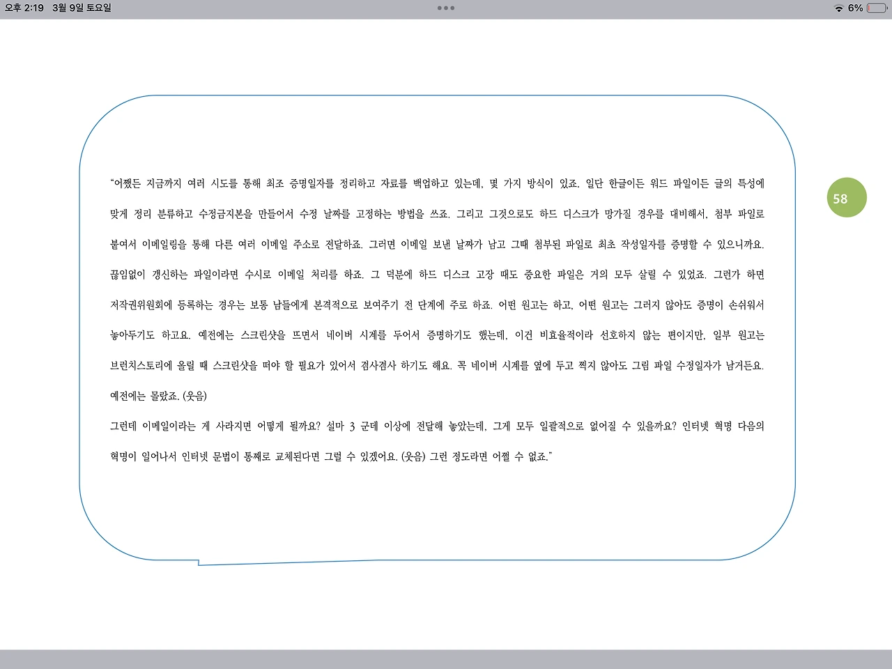 “어쨌든 지금까지 여러 시도를 통해 최조 증명일자를 정리하고 자료를 백업하고 있는데, 몇 가지 방식이 있죠. 일단 한글이든 워드 파일이든 글의 특성에 맞게 정리 분류하고 수정금지본을 만들어서 수정 날짜를 고정하는 방법을 쓰죠. 그리고 그것으로도 하드 디스크가 망가질 경우를 대비해서, 첨부 파일로 붙여서 이메일링을 통해 다른 여러 이메일 주소로 전달하죠. 그러면 이메일 보낸 날짜가 남고 그때 첨부된 파일로 최초 작성일자를 증명할 수 있으니까요. 끊임없이 갱신하는 파일이라면 수시로 이메일 처리를 하죠. 그 덕분에 하드 디스크 고장 때도 중요한 파일은 거의 모두 살릴 수 있었죠. 그런가 하면 저작권위원회에 등록하는 경우는 보통 남들에게 본격적으로 보여주기 전 단계에 주로 하죠. 어떤 원고는 하고, 어떤 원고는 그러지 않아도 증명이 손쉬워서 놓아두기도 하고요. 예전에는 스크린샷을 뜨면서 네이버 시계를 두어서 증명하기도 했는데, 이건 비효율적이라 선호하지 않는 편이지만, 일부 원고는 브런치스토리에 올릴 때 스크린샷을 떠야 할 필요가 있어서 겸사겸사 하기도 해요. 꼭 네이버 시계를 옆에 두고 찍지 않아도 그림 파일 수정일자가 남거든요. 예전에는 몰랐죠. (웃음)