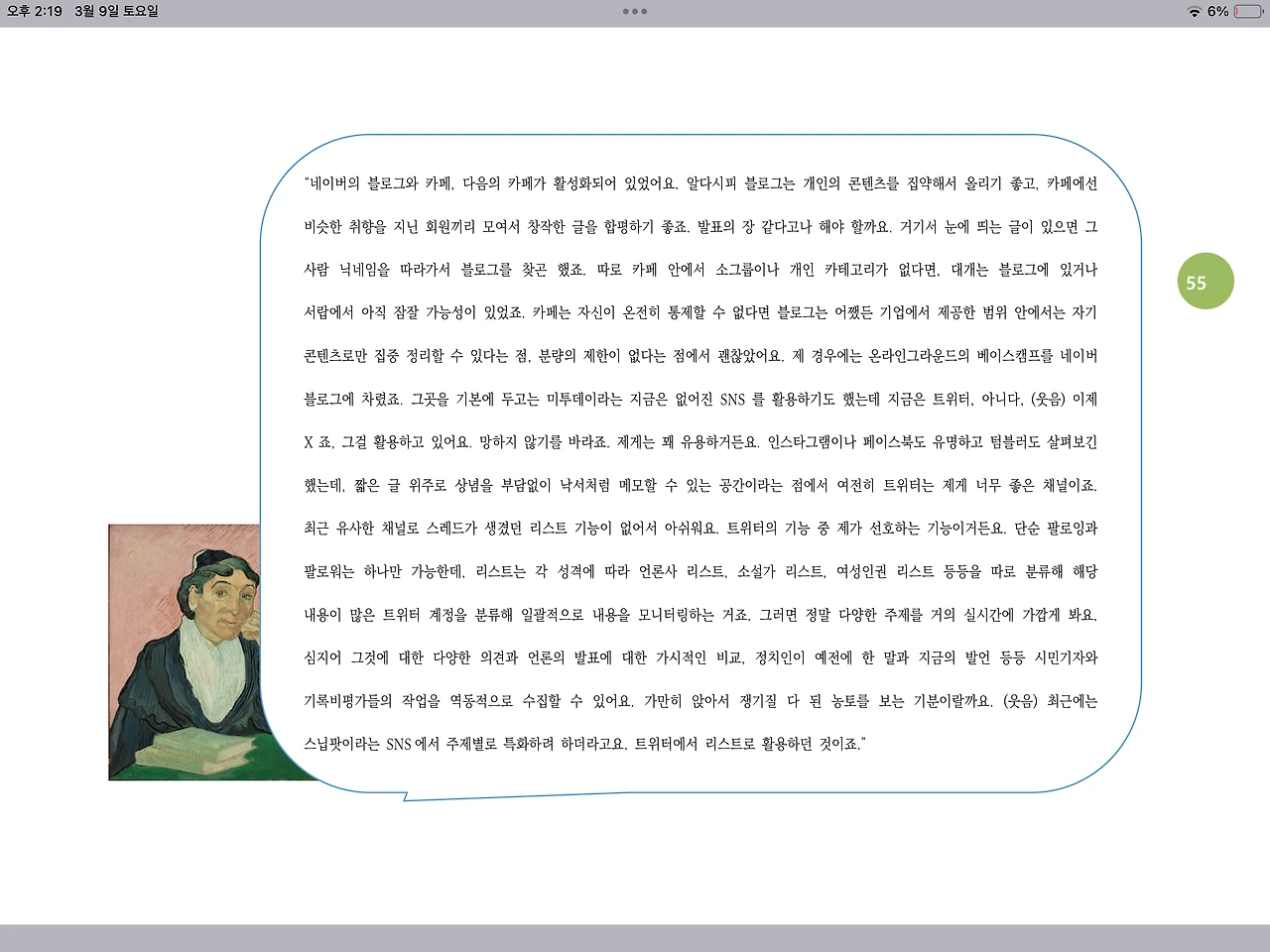 “네이버의 블로그와 카페, 다음의 카페가 활성화되어 있었어요. 알다시피 블로그는 개인의 콘텐츠를 집약해서 올리기 좋고, 카페에선 비슷한 취향을 지닌 회원끼리 모여서 창작한 글을 합평하기 좋죠. 발표의 장 같다고나 해야 할까요. 거기서 눈에 띄는 글이 있으면 그 사람 닉네임을 따라가서 블로그를 찾곤 했죠. 따로 카페 안에서 소그룹이나 개인 카테고리가 없다면, 대개는 블로그에 있거나 서랍에서 아직 잠잘 가능성이 있었죠. 카페는 자신이 온전히 통제할 수 없다면 블로그는 어쨌든 기업에서 제공한 범위 안에서는 자기 콘텐츠로만 집중 정리할 수 있다는 점, 분량의 제한이 없다는 점에서 괜찮았어요. 제 경우에는 온라인그라운드의 베이스캠프를 네이버 블로그에 차렸죠. 그곳을 기본에 두고는 미투데이라는 지금은 없어진 SNS를 활용하기도 했는데 지금은 트위터, 아니다, (웃음) 이제 X죠, 그걸 활용하고 있어요. 망하지 않기를 바라죠. 제게는 꽤 유용하거든요. 인스타그램이나 페이스북도 유명하고 텀블러도 살펴보긴 했는데, 짧은 글 위주로 상념을 부담없이 낙서처럼 메모할 수 있는 공간이라는 점에서 여전히 트위터는 제게 너무 좋은 채널이죠. 최근 유사한 채널로 스레드가 생겼던 리스트 기능이 없어서 아쉬워요. 트위터의 기능 중 제가 선호하는 기능이거든요. 단순 팔로잉과 팔로워는 하나만 가능한데, 리스트는 각 성격에 따라 언론사 리스트, 소설가 리스트, 여성인권 리스트 등등을 따로 분류해 해당 내용이 많은 트위터 계정을 분류해 일괄적으로 내용을 모니터링하는 거죠. 그러면 정말 다양한 주제를 거의 실시간에 가깝게 봐요. 심지어 그것에 대한 다양한 의견과 언론의 발표에 대한 가시적인 비교, 정치인이 예전에 한 말과 지금의 발언 등등 시민기자와 기록비평가들의 작업을 역동적으로 수집할 수 있어요. 가만히 앉아서 쟁기질 다 된 농토를 보는 기분이랄까요. (웃음) 최근에는 스닙팟이라는 SNS에서 주제별로 특화하려 하더라고요. 트위터에서 리스트로 활용하던 것이죠.”