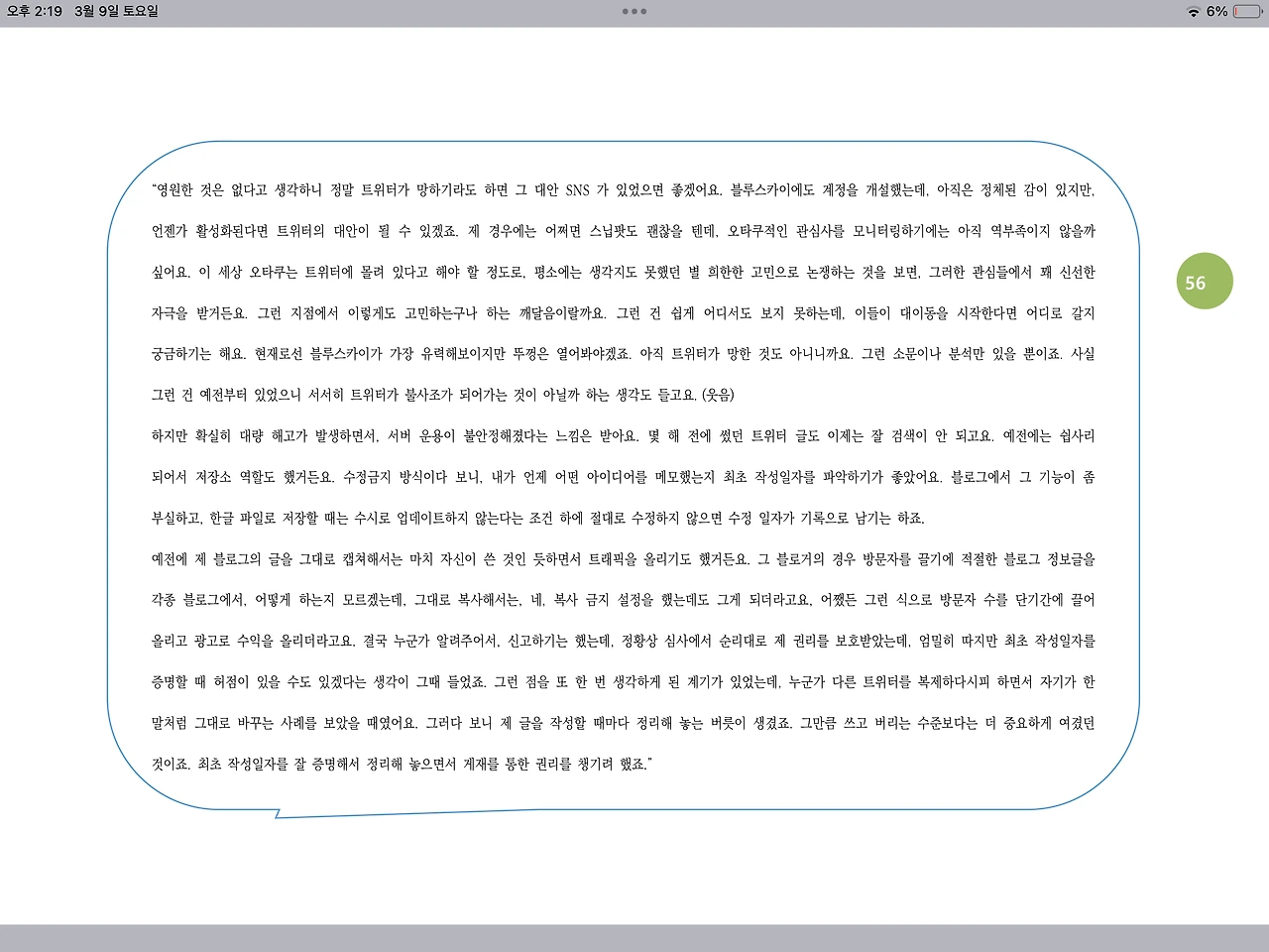 예전에 제 블로그의 글을 그대로 캡쳐해서는 마치 자신이 쓴 것처럼 게재해서 트래픽을 올리기도 했거든요. 그 블로거의 경우 방문자를 끌기에 적절한 블로그 정보글을 각종 블로그에서, 어떻게 하는지 모르겠는데, 그대로 복사해서는, 네, 복사 금지 설정을 했는데도 그게 되더라고요, 어쨌든 그런 식으로 방문자 수를 단기간에 끌어 올리고 광고로 수익을 올리더라고요. 결국 누군가 알려주어서, 신고하기는 했는데, 정황상 심사에서 순리대로 제 권리를 보호받았는데, 엄밀히 따지만 최초 작성일자를 증명할 때 허점이 있을 수도 있겠다는 생각이 그때 들었죠. 그런 점을 또 한 번 생각하게 된 계기가 있었는데, 누군가 다른 트위터를 복제하다시피 하면서 자기가 한 말처럼 그대로 바꾸는 사례를 보았을 때였어요. 그러다 보니 제 글을 작성할 때마다 정리해 놓는 버릇이 생겼죠. 그만큼 쓰고 버리는 수준보다는 더 중요하게 여겼던 것이죠. 최초 작성일자를 잘 증명해서 정리해 놓으면서 게재를 통한 권리를 챙기려 했죠.”