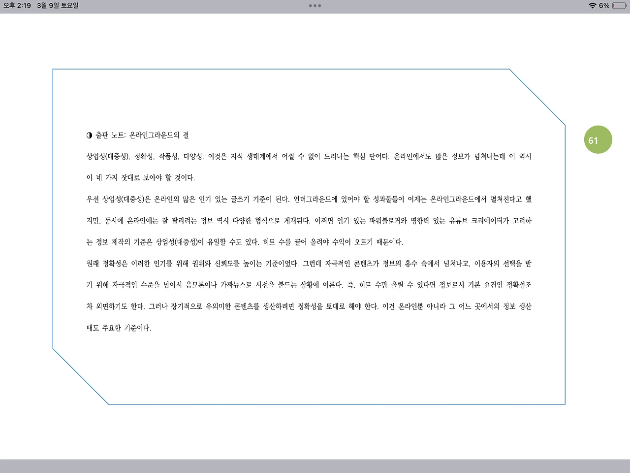 전체적으로 다양한 출판 형식을 경험하고 몽상하면서 지식 생태계의 건강한 시민 참여적 기여를 위해 어떤 방식으로 출판을 대해야 하는지 잡담합니다. 그 과정에서 '온라인그라운드, 전자책, 종이책'을 살피게 됩니다.