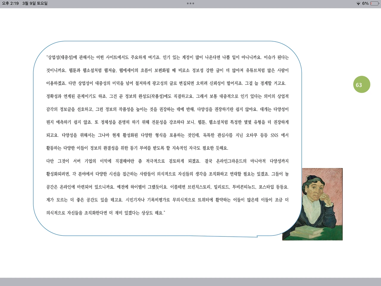 - 매거진 방식으로 작성하였습니다. 물론 실제로 다양한 저자를 섭외하지는 않고 단독으로 작업하였습니다. 매거진에서 다양한 글에 다양한 필자가 있기 마련인데, 여기서는 다중 정체성의 다른 인물을 연기하는 것처럼 고흐 이미지를 배치하고 여러 스타일의 글과 함께 구성하였습니다. 픽션 매거진이라고도 할 수 있으며 매거진 놀이로도 부를 수 있을 텐데, 이 원고의 경우 전체 흐름에선 사실과 경험을 토대로 하되 종종 일관된 방향성을 띠되 원활한 개진을 위하여 허구적 설정을 삽입하였습니다. 대체로 경험적 정보로 이해하셔도 무방합니다.
