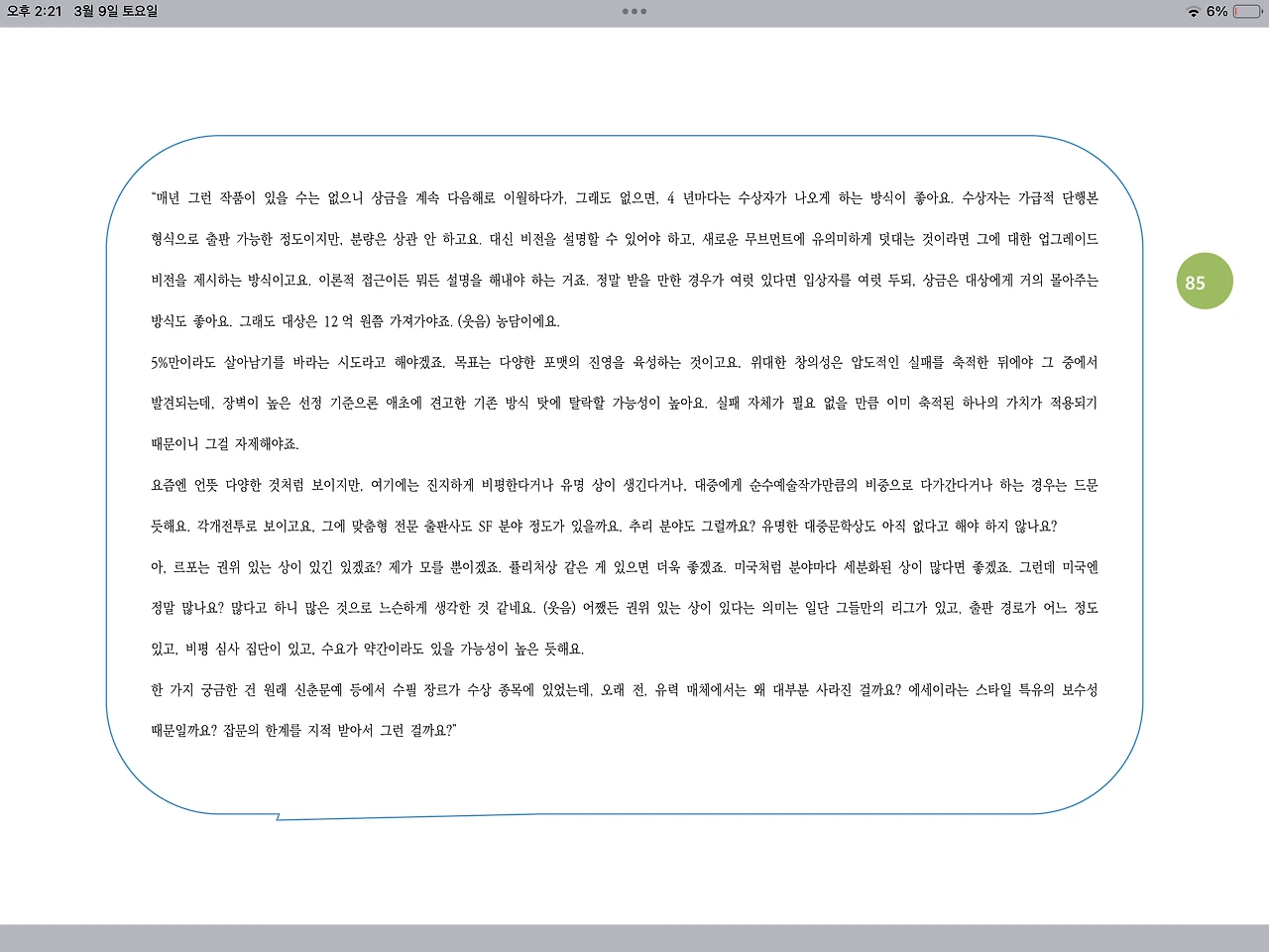 “언젠가 다양성문학상 같은 게 생겼으면 좋겠어요. 기존의 문학, 학계의 저술 말고, 르포 에세이 그 외 예상치 못할 어떤 형식 등 새로운 시도에 가장 주목하되, 새로운 인식과 다양한 소재의 발굴에 가중치를 부여하고, 기존 분야의 새로운 무브먼트에 힘을 싣는 쪽으로 방향성을 잡는 거죠.