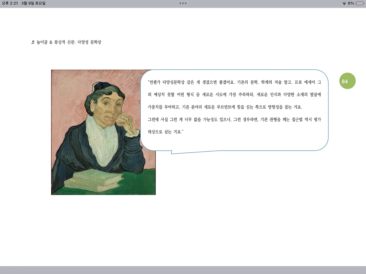 한 가지 궁금한 건 원래 신춘문예 등에서 수필 장르가 수상 종목에 있었는데, 오래 전, 유력 매체에서는 왜 대부분 사라진 걸까요? 에세이라는 스타일 특유의 보수성 때문일까요? 잡문의 한계를 지적 받아서 그런 걸까요?”