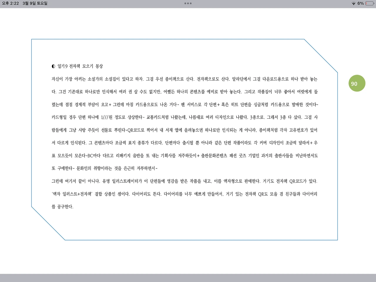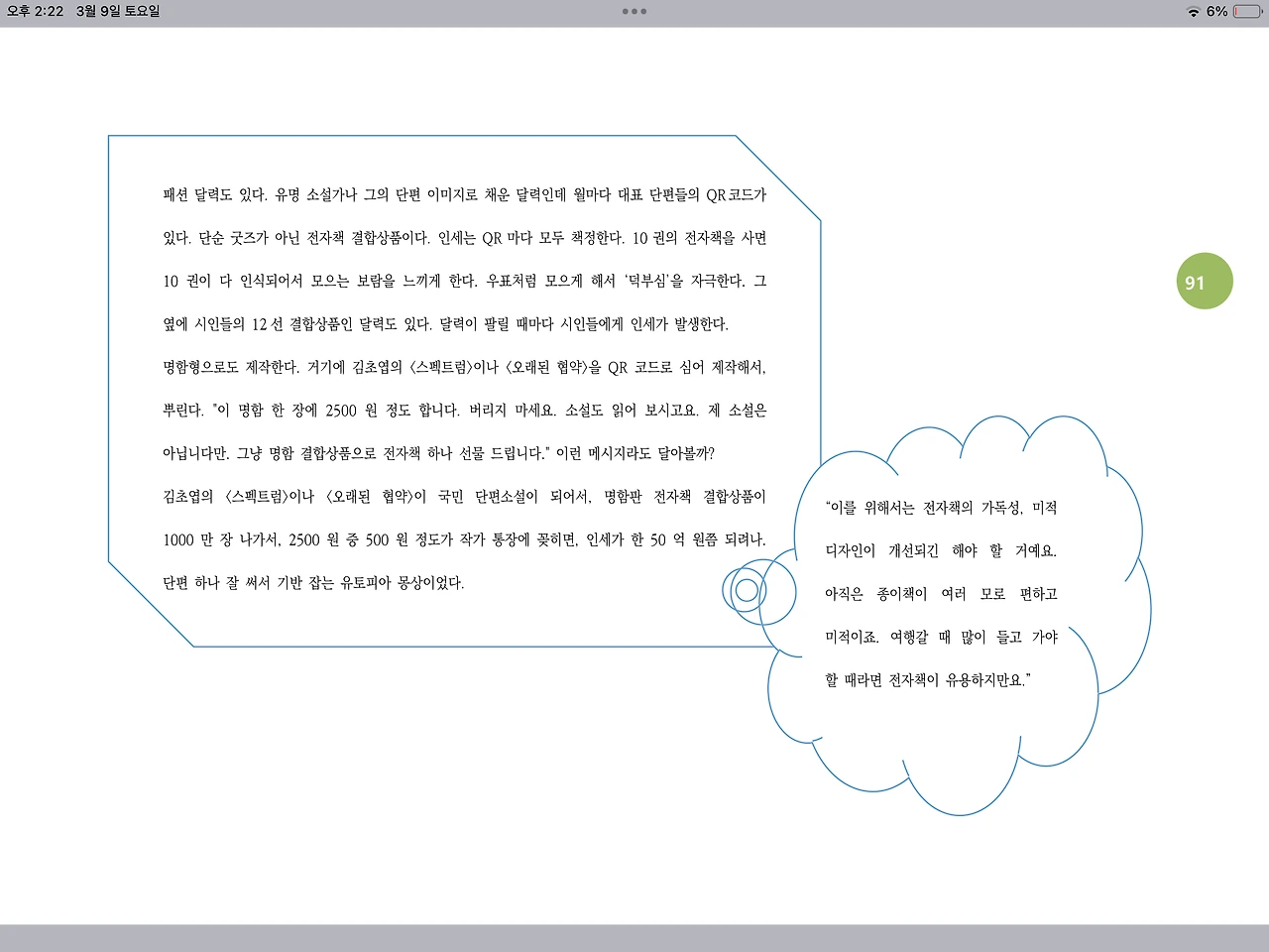 “이를 위해서는 전자책의 가독성, 미적 디자인이 개선되긴 해야 할 거예요. 아직은 종이책이 여러 모로 편하고 미적이죠. 여행갈 때 많이 들고 가야 할 때라면 전자책이 유용하지만요.”