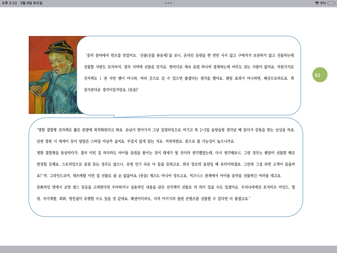 문화적인 면에서 교양 센스 등등을 고려한다면 우아하거나 실용적인 내용을 담은 전자책이 선물로 더 의미 있을 수도 있겠어요. 우리나라에선 포지티브 마인드, 힐링, 자기계발, 회화, 명언집이 유행할 수도 있을 것 같네요. 패션이더라도, 지적 이미지의 출판 콘텐츠를 선물할 수 있다면 더 좋겠고요.”