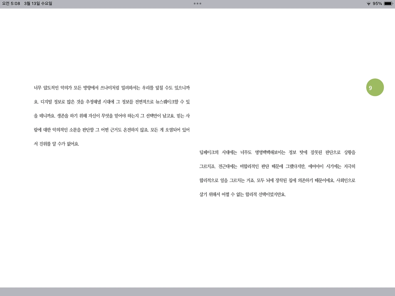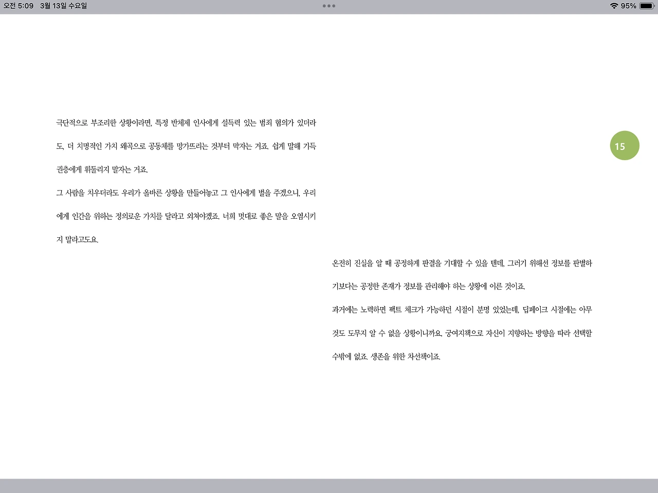 아무것도 믿을 수 없을 때는 명료하고 간결한 원칙을 생각할 수밖에 없어요. 자신이 원하는 이상이 무엇인가 하고요. 인간이 바로 서는 민주주의, 인간의 얼굴을 한 자본주의를 원한다면, 그게 이루어야 할 이상적인 체제라면, 어느 쪽으로 편향성을 지닌 뉴스가 가짜일 때 더 치명적인가를 생각해야 해요. 가짜뉴스를 판별하기보다는요. 애초에 어려우니까요.