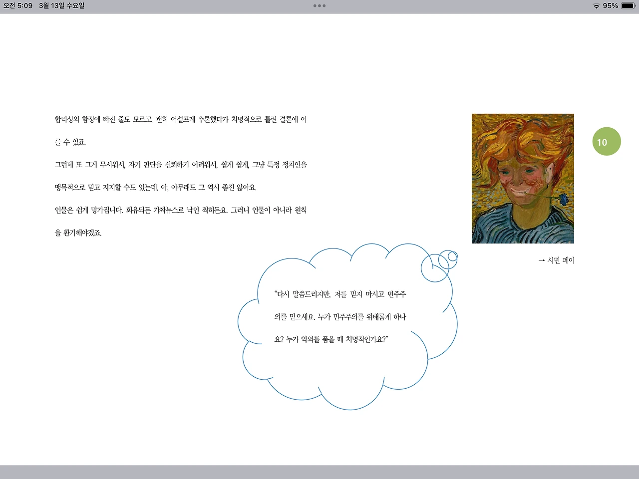 “다시 말씀드리지만, 저를 믿지 마시고 민주주의를 믿으세요. 누가 민주주의를 위태롭게 하나요? 누가 악의를 품을 때 치명적인가요?” → 시민 페이