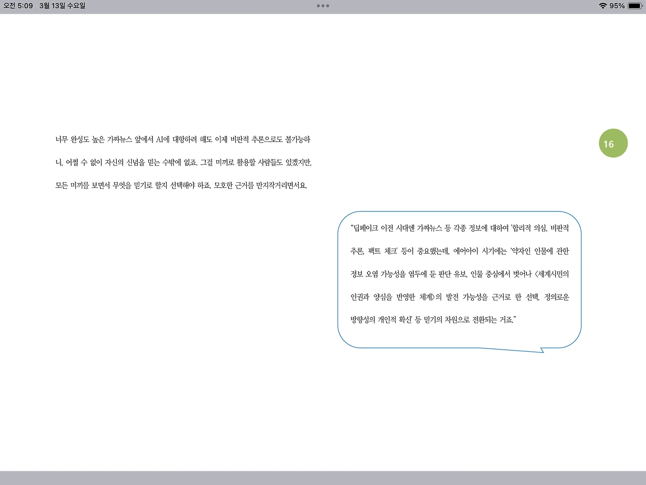 “딥페이크 이전 시대엔 가짜뉴스 등 각종 정보에 대하여 '합리적 의심, 비판적 추론, 팩트 체크' 등이 중요했는데, 에어아이 시기에는 ‘약자인 인물에 관한 정보 오염 가능성을 염두에 둔 판단 유보, 인물 중심에서 벗어나 <세계시민의 인권과 양심을 반영한 체계>의 발전 가능성을 근거로 한 선택, 정의로운 방향성의 개인적 확신' 등 믿기의 차원으로 전환되는 거죠.”
