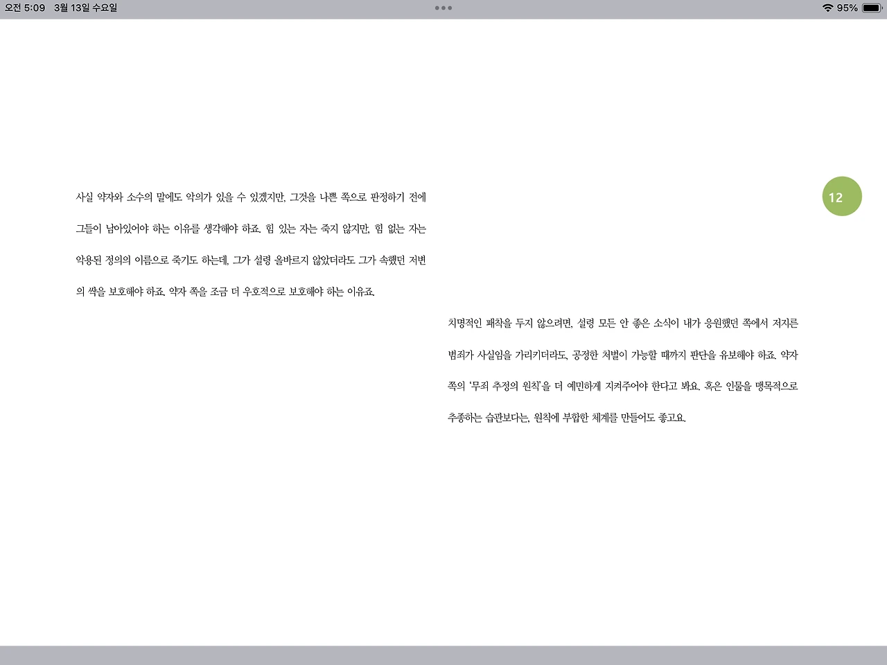 사실 약자와 소수의 말에도 악의가 있을 수 있겠지만, 그것을 나쁜 쪽으로 판정하기 전에 그들이 남아있어야 하는 이유를 생각해야 하죠. 힘 있는 자는 죽지 않지만, 힘 없는 자는 악용된 정의의 이름으로 죽기도 하는데, 그가 설령 올바르지 않았더라도 그가 속했던 저변의 싹을 보호해야 하죠. 약자 쪽을 조금 더 우호적으로 보호해야 하는 이유죠.