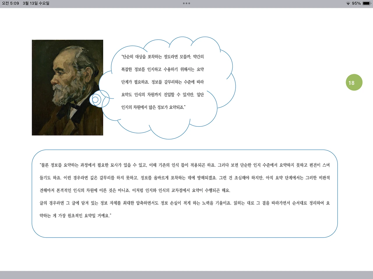 “물론 정보를 요약하는 과정에서 필요한 묘사가 있을 수 있고, 이때 기존의 인식 틀이 적용되곤 하죠. 그러다 보면 단순한 인지 수준에서 요약하지 못하고 편견이 스며들기도 하죠. 이런 경우라면 깊은 갈무리를 하지 못하고, 정보를 올바르게 포착하는 데에 방해되겠죠. 그런 건 조심해야 하지만, 아직 요약 단계에서는 그러한 비판적 견해마저 본격적인 인식의 차원에 이른 것은 아니죠. 이처럼 인지와 인식의 교차점에서 요약이 수행되곤 해요.
