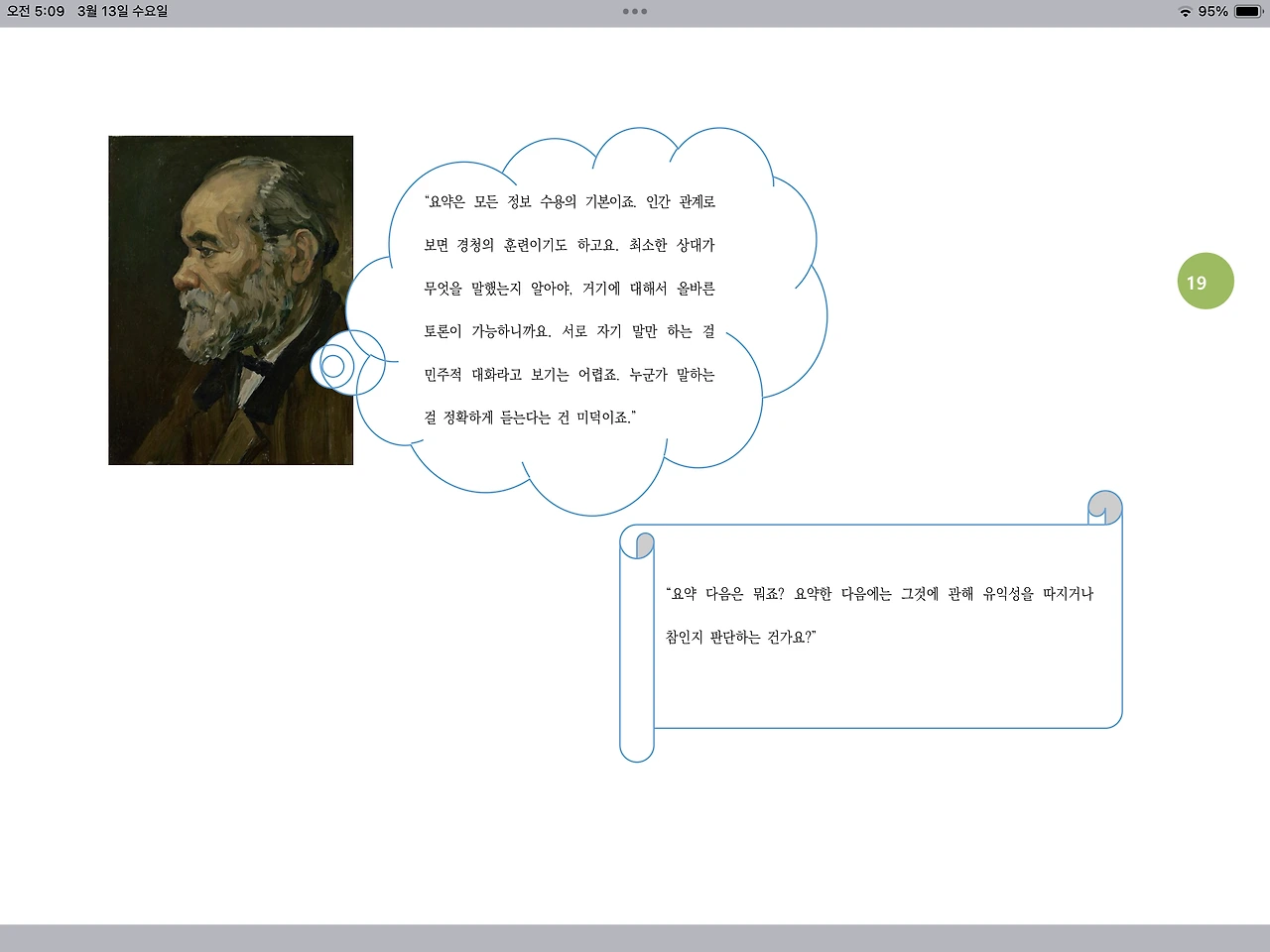 “요약은 모든 정보 수용의 기본이죠. 인간 관계로 보면 경청의 훈련이기도 하고요. 최소한 상대가 무엇을 말했는지 알아야, 거기에 대해서 올바른 토론이 가능하니까요. 서로 자기 말만 하는 걸 민주적 대화라고 보기는 어렵죠. 누군가 말하는 걸 정확하게 듣는다는 건 미덕이죠.”