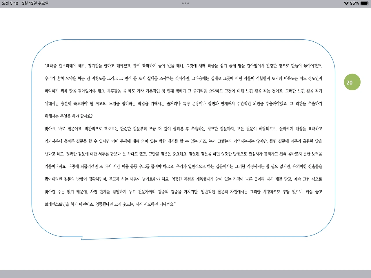 “요약을 갈무리해야 해요. 쟁기질을 한다고 해야겠죠. 땅이 딱딱하게 굳어 있을 테니, 그것에 재배 작물을 심기 좋게 땅을 갈아엎어서 말랑한 땅으로 만들어 놓아야겠죠. 우리가 흔히 요약을 하는 건 지형도를 그리고 그 면적 등 토지 실태를 조사하는 것이라면, 그다음에는 실제로 그곳에 어떤 작물이 적합한지 토지의 비옥도는 어느 정도인지 파악하기 위해 땅을 갈아엎어야 해요. 독후감을 쓸 때도 가장 기본적인 첫 번째 형태가 그 줄거리를 요약하고 그것에 대해 느낀 점을 적는 것이죠. 그러한 느낀 점을 적기 위해서는 충분히 숙고해야 할 거고요. 느낌을 정리하는 작업을 위해서는 줄거리나 특정 문장이나 장면과 연계해서 주관적인 의견을 추출해야겠죠. 그 의견을 추출하기 위해서는 무엇을 해야 할까요?