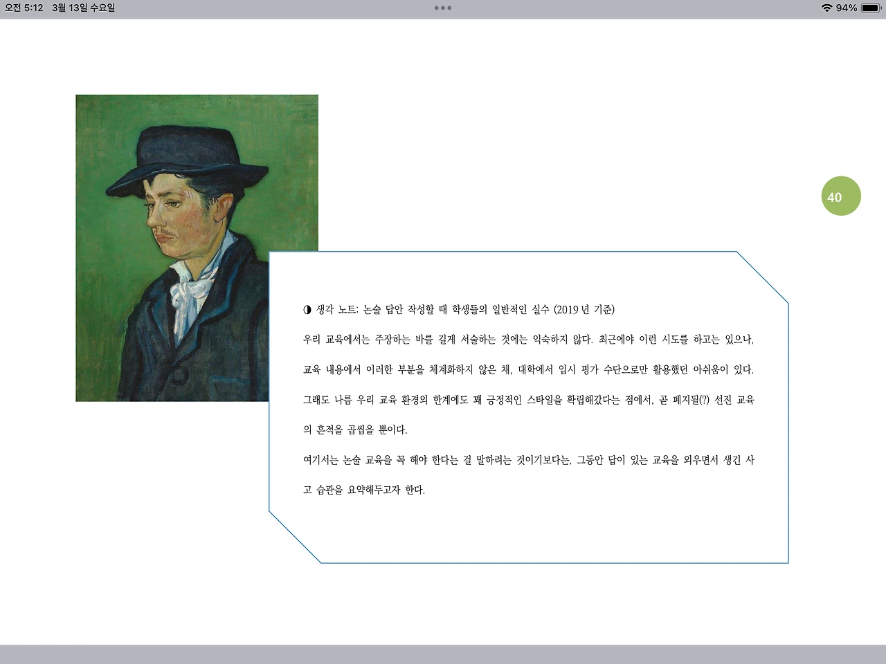 우리 교육에서는 주장하는 바를 길게 서술하는 것에는 익숙하지 않다. 최근에야 이런 시도를 하고는 있으나, 교육 내용에서 이러한 부분을 체계화하지 않은 채, 대학에서 입시 평가 수단으로만 활용했던 아쉬움이 있다. 그래도 나름 우리 교육 환경의 한계에도 꽤 긍정적인 스타일을 확립해갔다는 점에서, 곧 폐지될(?) 선진 교육의 흔적을 곱씹을 뿐이다.