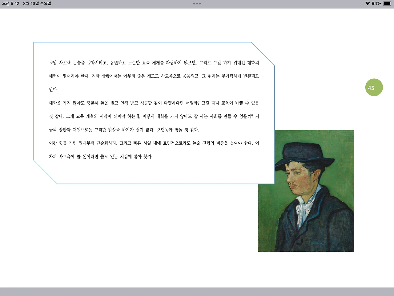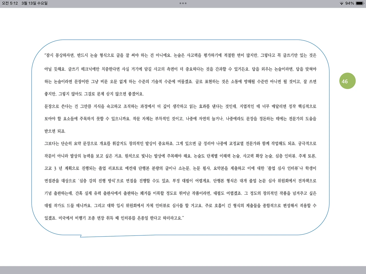 “잠시 몽상하자면, 반드시 논술 형식으로 글을 잘 써야 하는 건 아니에요. 논술은 사고력을 평가하기에 적절한 면이 많지만, 그렇다고 꼭 글쓰기만 있는 것은 아닐 듯해요. 글쓰기 테크닉에만 치중한다면 사실 거기에 담길 사고의 측면이 더 중요하다는 것을 간과할 수 있거든요. 답을 외우는 논술이라면, 답을 맞혀야 하는 논술이라면 문장이란 그냥 비문 오문 없게 하는 수준의 기술적 수준에 머물겠죠. 글로 표현하는 것은 소통에 방해될 수준만 아니면 될 것이고, 잘 쓰면 좋지만, 그렇지 않아도 그걸로 문제 삼지 않으면 좋겠어요.