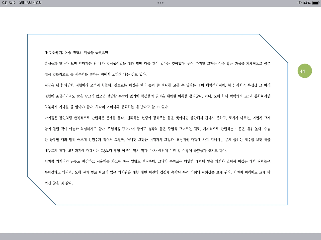 ◑ 한눈팔기: 논술 전형의 비중을 높였으면