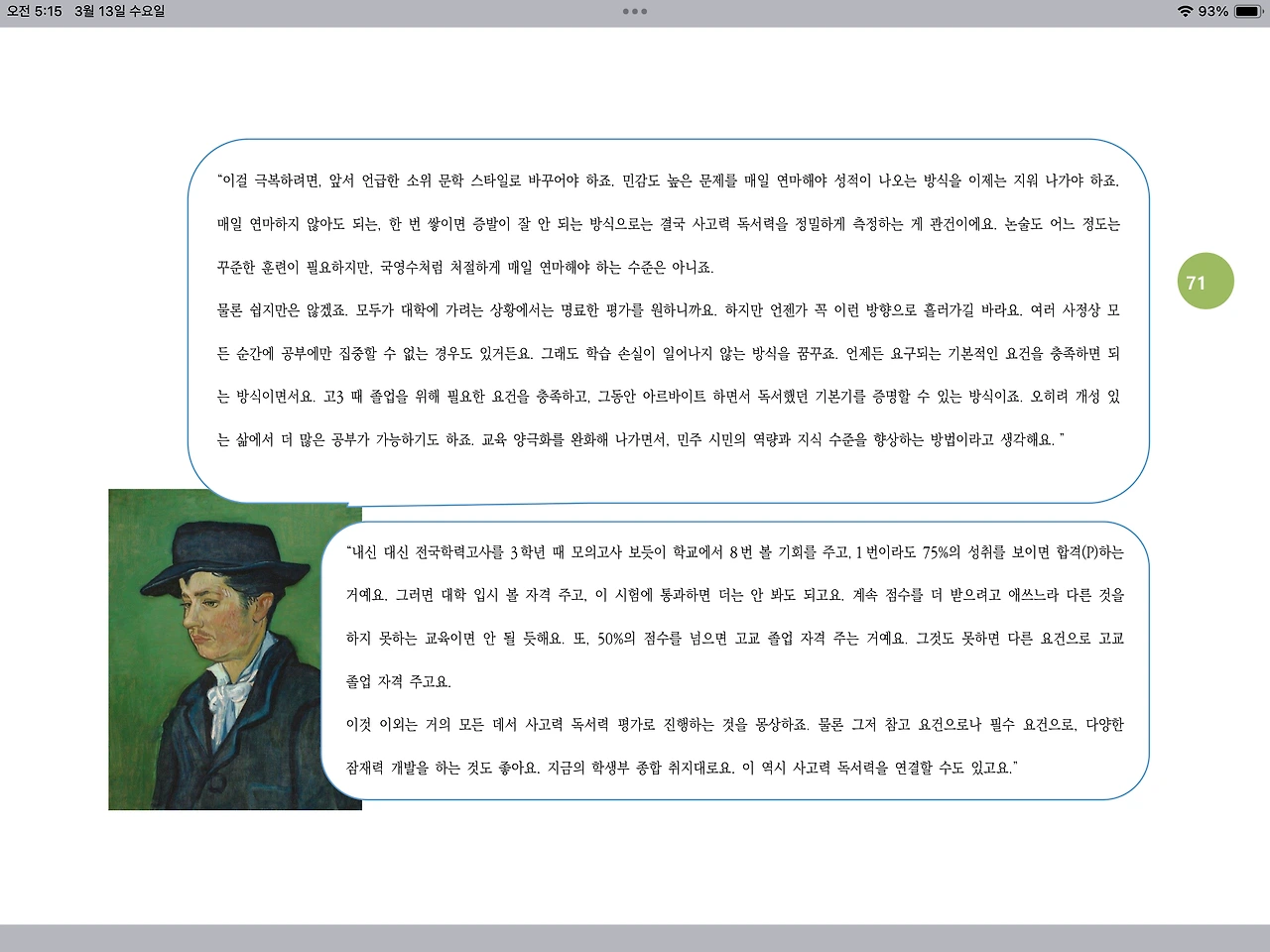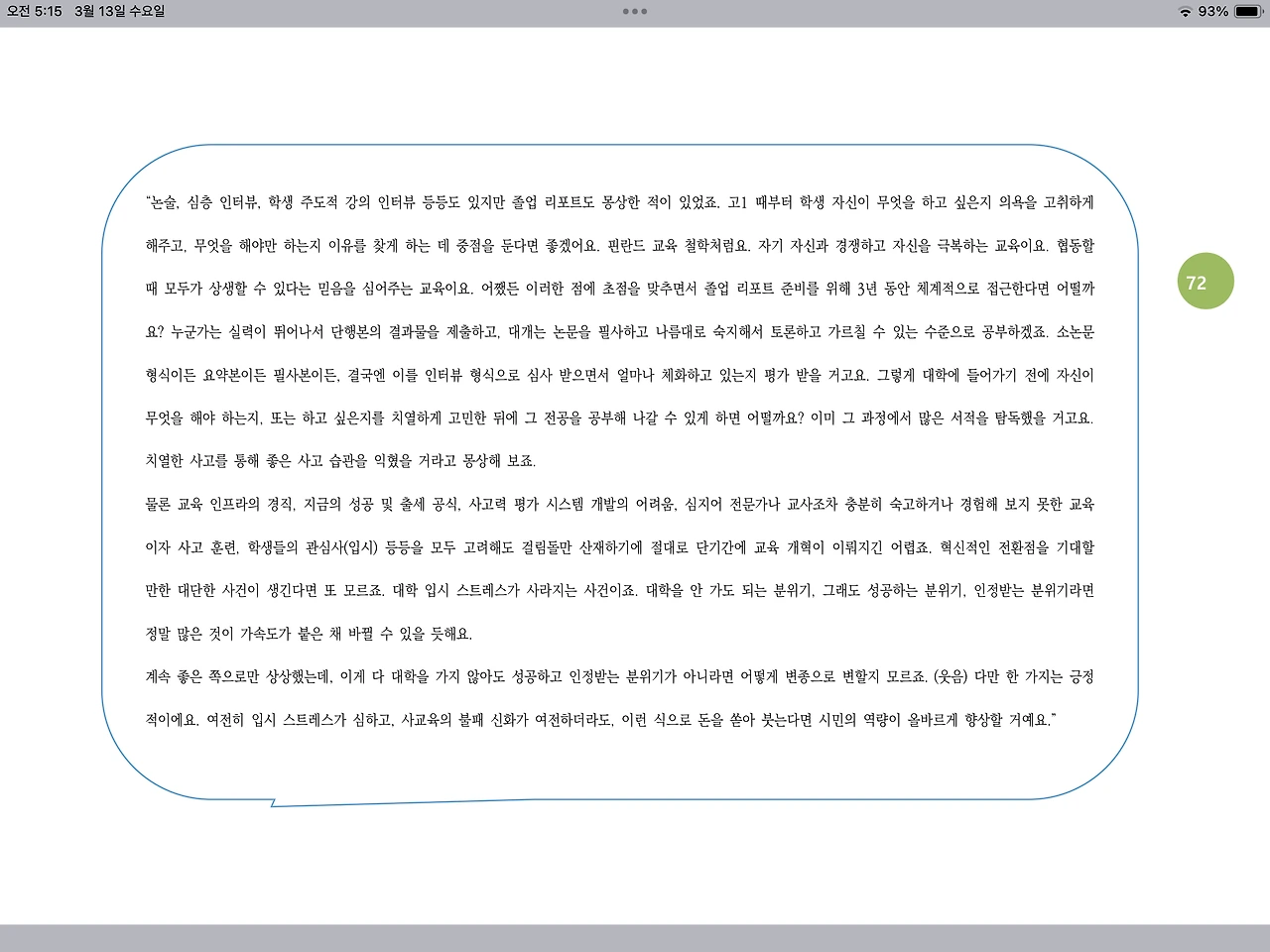 이것 이외는 거의 모든 데서 사고력 독서력 평가로 진행하는 것을 몽상하죠. 물론 그저 참고 요건으로나 필수 요건으로, 다양한 잠재력 개발을 하는 것도 좋아요. 지금의 학생부 종합 취지대로요. 이 역시 사고력 독서력을 연결할 수도 있고요.”