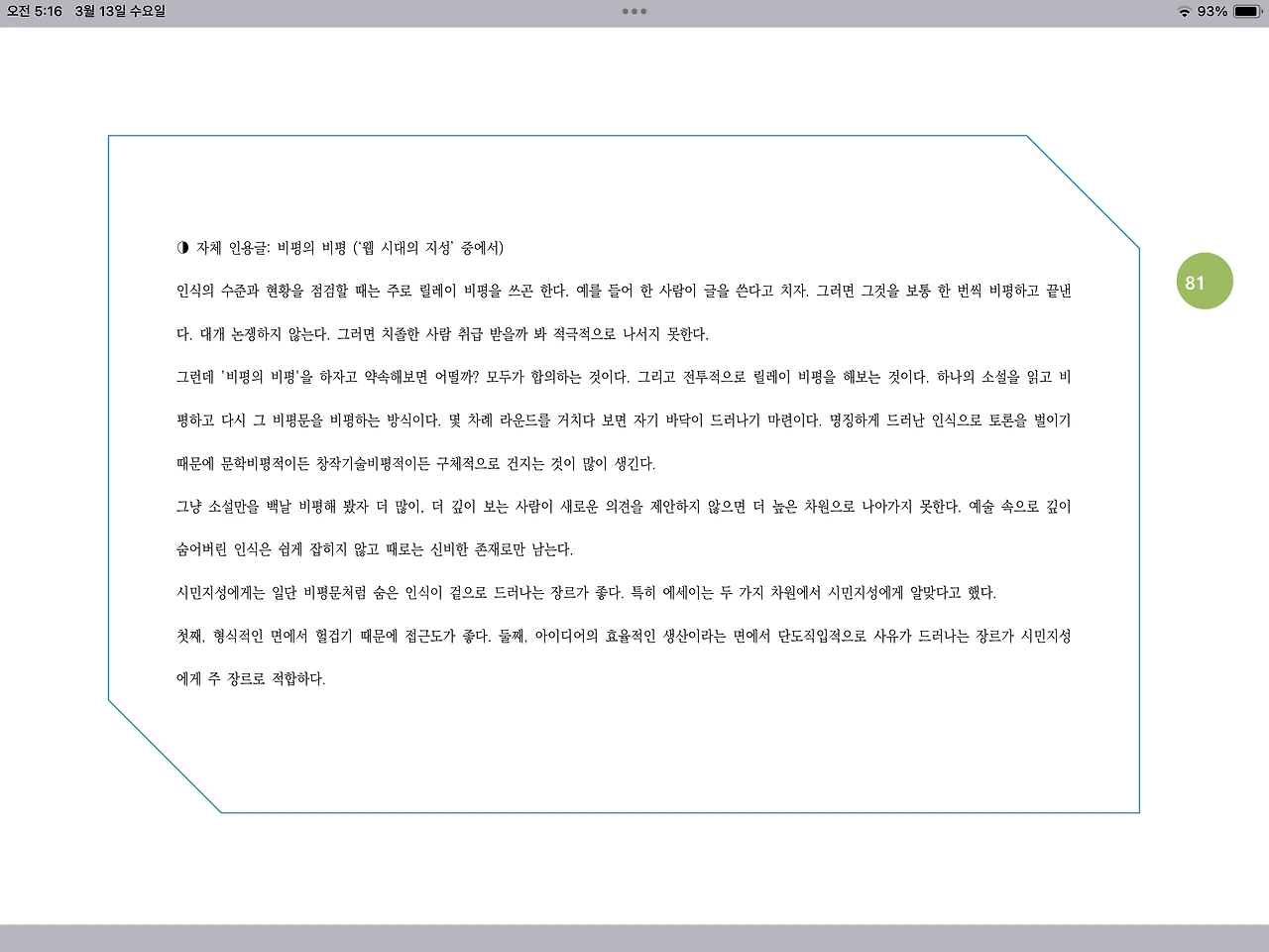 시민지성에게는 일단 비평문처럼 숨은 인식이 겉으로 드러나는 장르가 좋다. 특히 에세이는 두 가지 차원에서 시민지성에게 알맞다고 했다.