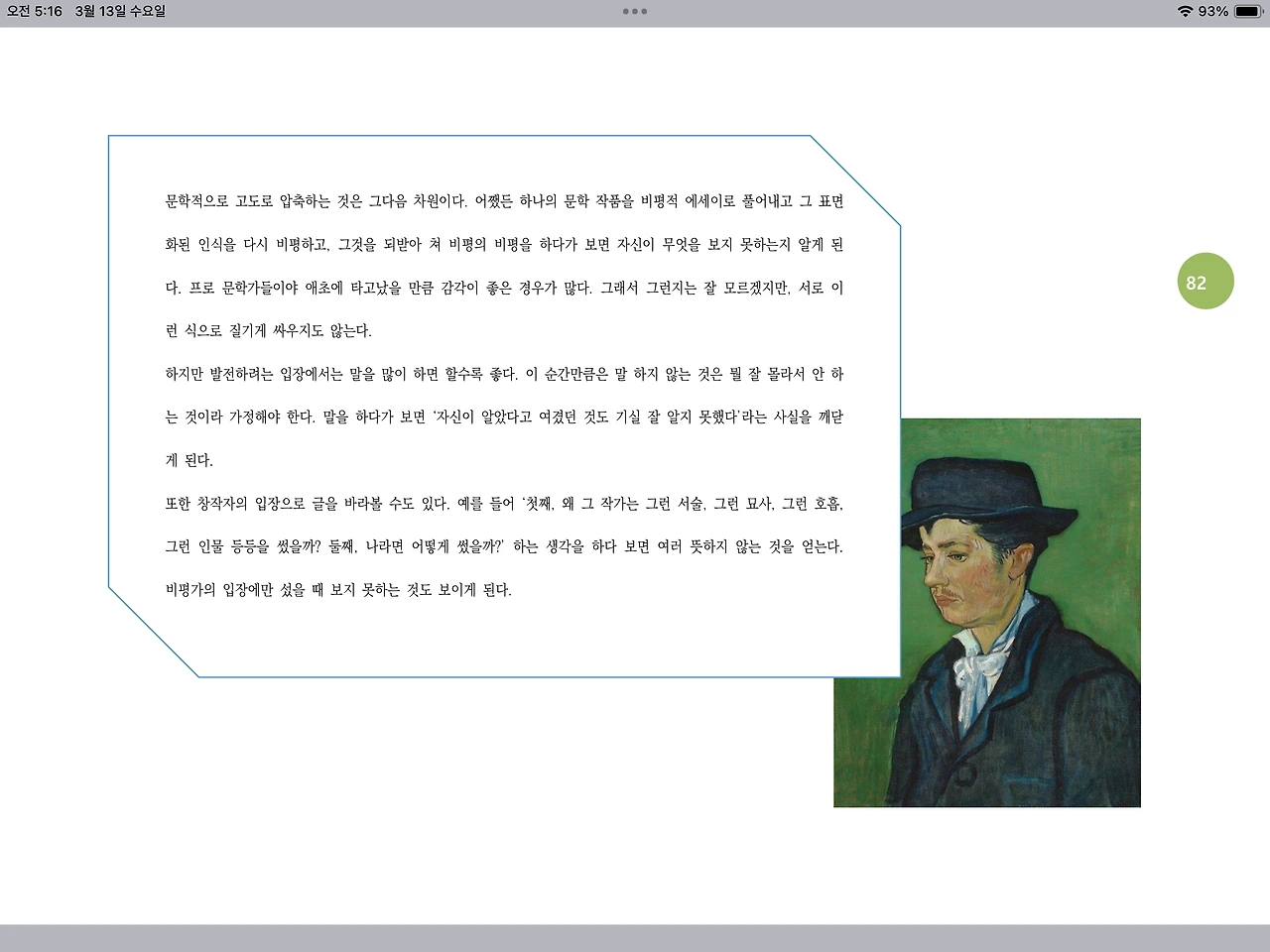 문학적으로 고도로 압축하는 것은 그다음 차원이다. 어쨌든 하나의 문학 작품을 비평적 에세이로 풀어내고 그 표면화된 인식을 다시 비평하고, 그것을 되받아 쳐 비평의 비평을 하다가 보면 자신이 무엇을 보지 못하는지 알게 된다. 프로 문학가들이야 애초에 타고났을 만큼 감각이 좋은 경우가 많다. 그래서 그런지는 잘 모르겠지만, 서로 이런 식으로 질기게 싸우지도 않는다.