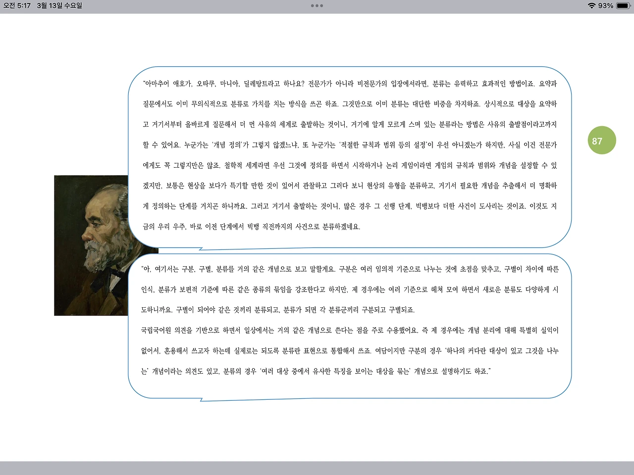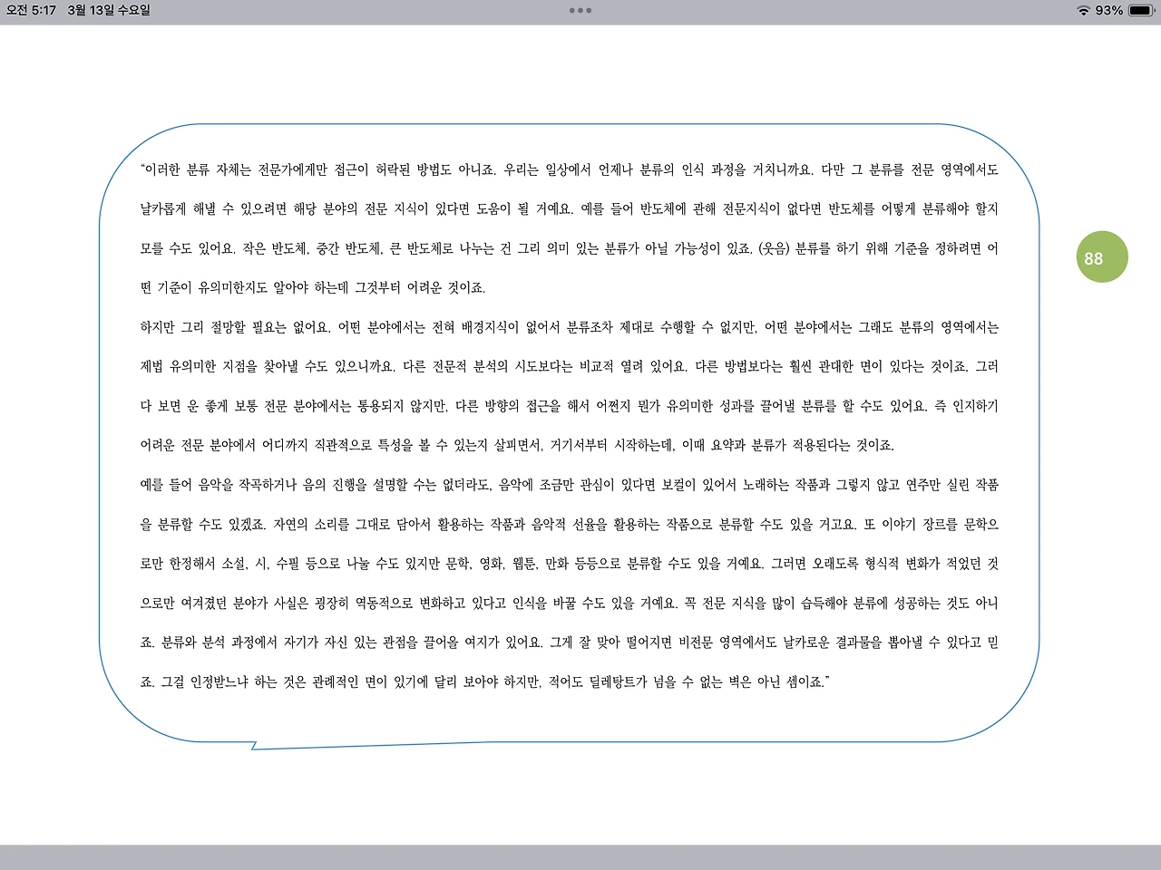 “아, 여기서는 구분, 구별, 분류를 거의 같은 개념으로 보고 말할게요. 구분은 여러 임의적 기준으로 나누는 것에 초점을 맞추고, 구별이 차이에 따른 인식, 분류가 보편적 기준에 따른 같은 종류의 묶임을 강조한다고 하지만, 제 경우에는 여러 기준으로 헤쳐 모여 하면서 새로운 분류도 다양하게 시도하니까요. 구별이 되어야 같은 것끼리 분류되고, 분류가 되면 각 분류군끼리 구분되고 구별되죠.