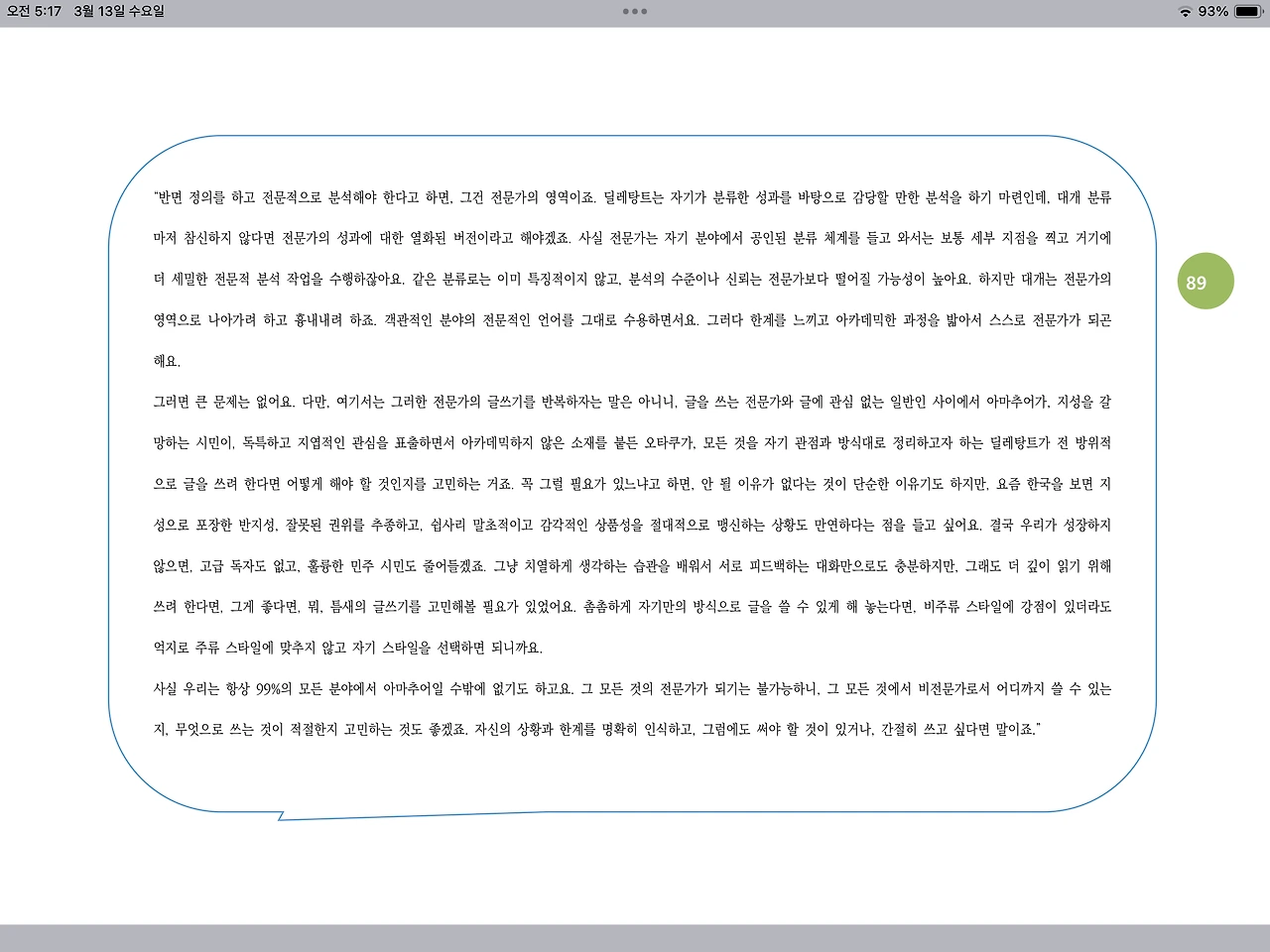 그러면 큰 문제는 없어요. 다만, 여기서는 그러한 전문가의 글쓰기를 반복하자는 말은 아니니, 글을 쓰는 전문가와 글에 관심 없는 일반인 사이에서 아마추어가, 지성을 갈망하는 시민이, 독특하고 지엽적인 관심을 표출하면서 아카데믹하지 않은 소재를 붙든 오타쿠가, 모든 것을 자기 관점과 방식대로 정리하고자 하는 딜레탕트가 전 방위적으로 글을 쓰려 한다면 어떻게 해야 할 것인지를 고민하는 거죠. 꼭 그럴 필요가 있느냐고 하면, 안 될 이유가 없다는 것이 단순한 이유기도 하지만, 요즘 한국을 보면 지성으로 포장한 반지성, 잘못된 권위를 추종하고, 쉽사리 말초적이고 감각적인 상품성을 절대적으로 맹신하는 상황도 만연하다는 점을 들고 싶어요. 결국 우리가 성장하지 않으면, 고급 독자도 없고, 훌륭한 민주 시민도 줄어들겠죠. 그냥 치열하게 생각하는 습관을 배워서 서로 피드백하는 대화만으로도 충분하지만, 그래도 더 깊이 읽기 위해 쓰려 한다면, 그게 좋다면, 뭐, 틈새의 글쓰기를 고민해볼 필요가 있었어요. 촘촘하게 자기만의 방식으로 글을 쓸 수 있게 해 놓는다면, 비주류 스타일에 강점이 있더라도 억지로 주류 스타일에 맞추지 않고 자기 스타일을 선택하면 되니까요.