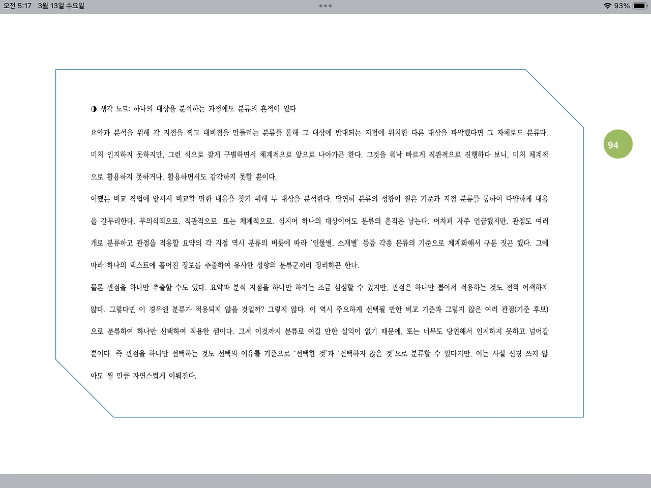 물론 관점을 하나만 추출할 수도 있다. 요약과 분석 지점을 하나만 하기는 조금 심심할 수 있지만, 관점은 하나만 뽑아서 적용하는 것도 전혀 어색하지 않다. 그렇다면 이 경우엔 분류가 적용되지 않을 것일까? 그렇지 않다. 이 역시 주요하게 선택될 만한 비교 기준과 그렇지 않은 여러 관점(기준 후보)으로 분류하여 하나만 선택하여 적용한 셈이다. 그저 이것까지 분류로 여길 만한 실익이 없기 때문에, 또는 너무도 당연해서 인지하지 못하고 넘어갈 뿐이다. 즉 관점을 하나만 선택하는 것도 선택의 이유를 기준으로 ‘선택한 것’과 ‘선택하지 않은 것’으로 분류할 수 있다지만, 이는 사실 신경 쓰지 않아도 될 만큼 자연스럽게 이뤄진다.