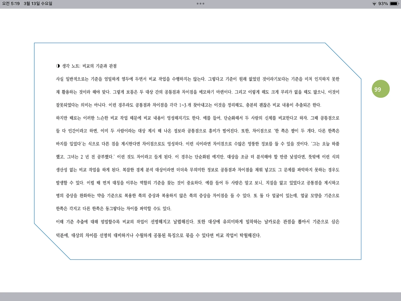 사실 일반적으로는 기준을 엄밀하게 염두에 두면서 비교 작업을 수행하지는 않는다. 그렇다고 기준이 원래 없었던 것이라기보다는 기준을 미처 인지하지 못한 채 활용하는 것이라 해야 맞다. 그렇게 보통은 두 대상 간의 공통점과 차이점을 메모하기 마련이다. 그리고 이렇게 해도 크게 무리가 없을 때도 많으니, 이것이 잘못되었다는 의미는 아니다. 이런 경우라도 공통점과 차이점을 각각 1~3개 찾아내고는 이것을 정리해도, 충분히 괜찮은 비교 내용이 추출되곤 한다.