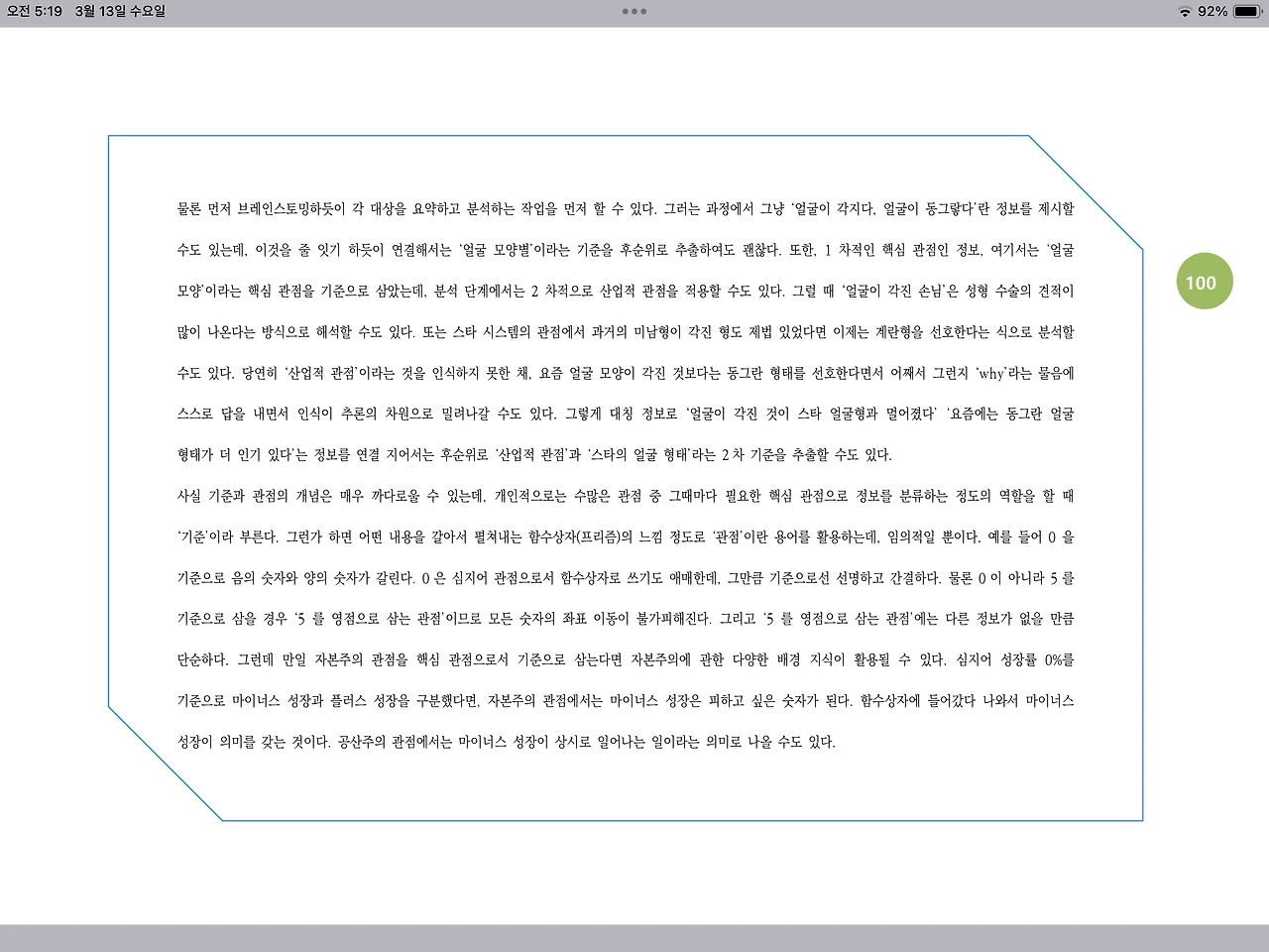 물론 먼저 브레인스토밍하듯이 각 대상을 요약하고 분석하는 작업을 먼저 할 수 있다. 그러는 과정에서 그냥 ‘얼굴이 각지다, 얼굴이 동그랗다’란 정보를 제시할 수도 있는데, 이것을 줄 잇기 하듯이 연결해서는 ‘얼굴 모양별’이라는 기준을 후순위로 추출하여도 괜찮다. 또한, 1차적인 핵심 관점인 정보, 여기서는 ‘얼굴 모양’이라는 핵심 관점을 기준으로 삼았는데, 분석 단계에서는 2차적으로 산업적 관점을 적용할 수도 있다. 그럴 때 ‘얼굴이 각진 손님’은 성형 수술의 견적이 많이 나온다는 방식으로 해석할 수도 있다. 또는 스타 시스템의 관점에서 과거의 미남형이 각진 형도 제법 있었다면 이제는 계란형을 선호한다는 식으로 분석할 수도 있다. 당연히 ‘산업적 관점’이라는 것을 인식하지 못한 채, 요즘 얼굴 모양이 각진 것보다는 동그란 형태를 선호한다면서 어째서 그런지 ‘why’라는 물음에 스스로 답을 내면서 인식이 추론의 차원으로 밀려나갈 수도 있다. 그렇게 대칭 정보로 ‘얼굴이 각진 것이 스타 얼굴형과 멀어졌다’ ‘요즘에는 동그란 얼굴 형태가 더 인기 있다’는 정보를 연결 지어서는 후순위로 ‘산업적 관점’과 ‘스타의 얼굴 형태’라는 2차 기준을 추출할 수도 있다.