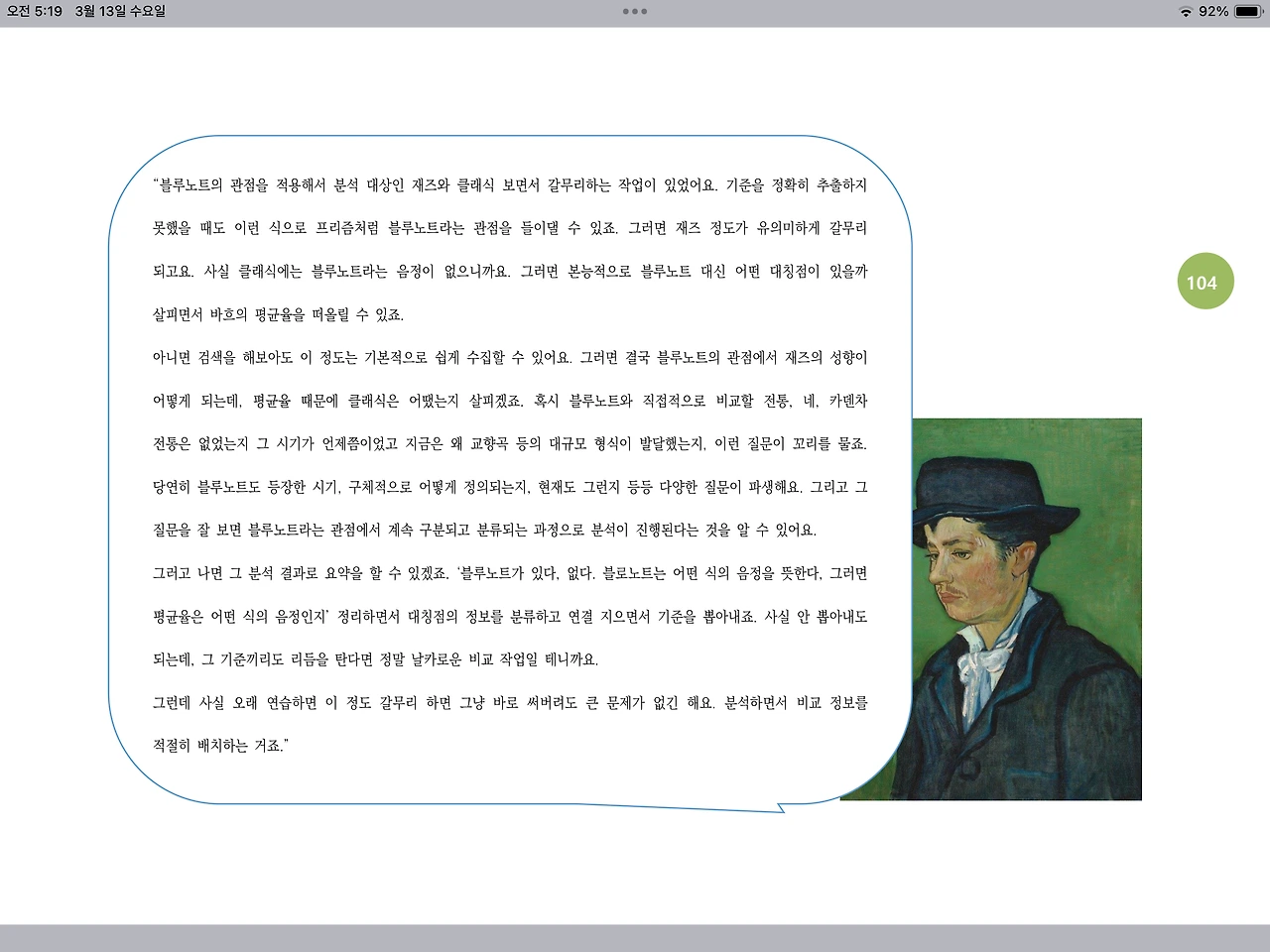 “블루노트의 관점을 적용해서 분석 대상인 재즈와 클래식 보면서 갈무리하는 작업이 있었어요. 기준을 정확히 추출하지 못했을 때도 이런 식으로 프리즘처럼 블루노트라는 관점을 들이댈 수 있죠. 그러면 재즈 정도가 유의미하게 갈무리 되고요. 사실 클래식에는 블루노트라는 음정이 없으니까요. 그러면 본능적으로 블루노트 대신 어떤 대칭점이 있을까 살피면서 바흐의 평균율을 떠올릴 수 있죠.
