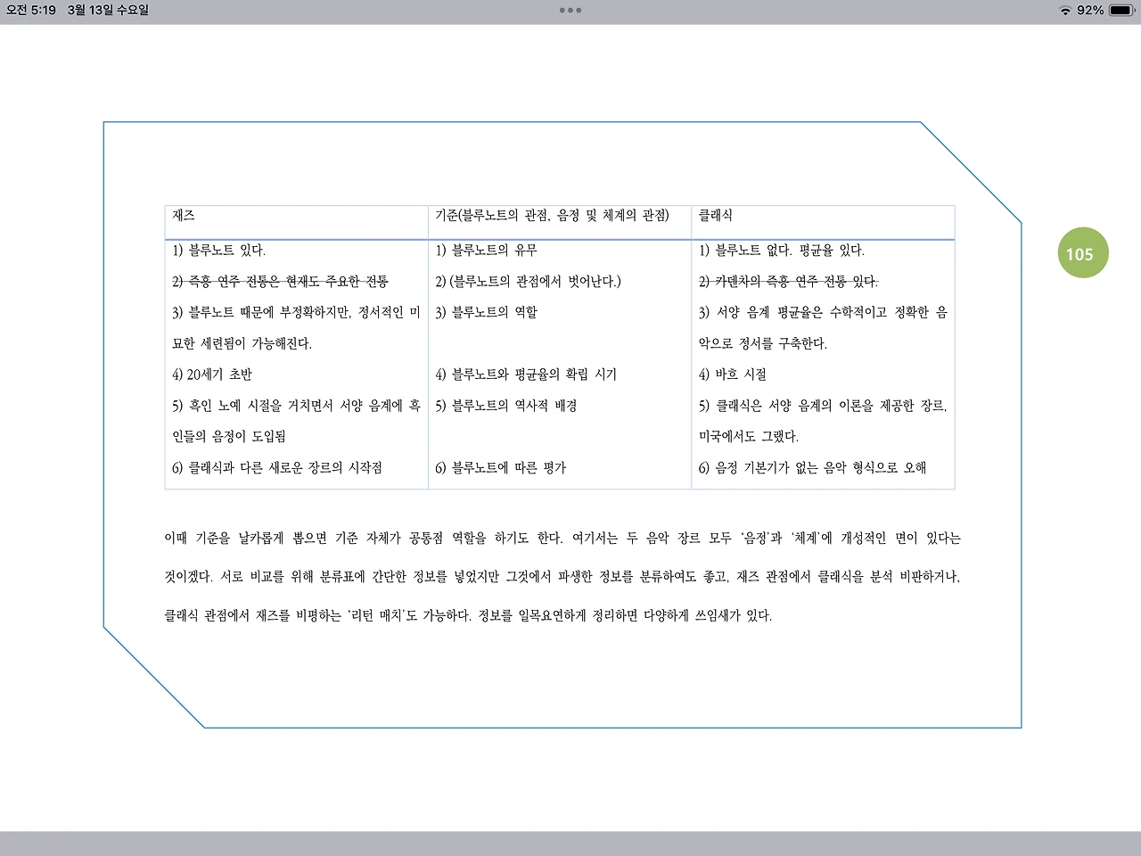 아니면 검색을 해보아도 이 정도는 기본적으로 쉽게 수집할 수 있어요. 그러면 결국 블루노트의 관점에서 재즈의 성향이 어떻게 되는데, 평균율 때문에 클래식은 어땠는지 살피겠죠. 혹시 블루노트와 직접적으로 비교할 전통, 네, 카덴차 전통은 없었는지 그 시기가 언제쯤이었고 지금은 왜 교향곡 등의 대규모 형식이 발달했는지, 이런 질문이 꼬리를 물죠. 당연히 블루노트도 등장한 시기, 구체적으로 어떻게 정의되는지, 현재도 그런지 등등 다양한 질문이 파생해요. 그리고 그 질문을 잘 보면 블루노트라는 관점에서 계속 구분되고 분류되는 과정으로 분석이 진행된다는 것을 알 수 있어요.