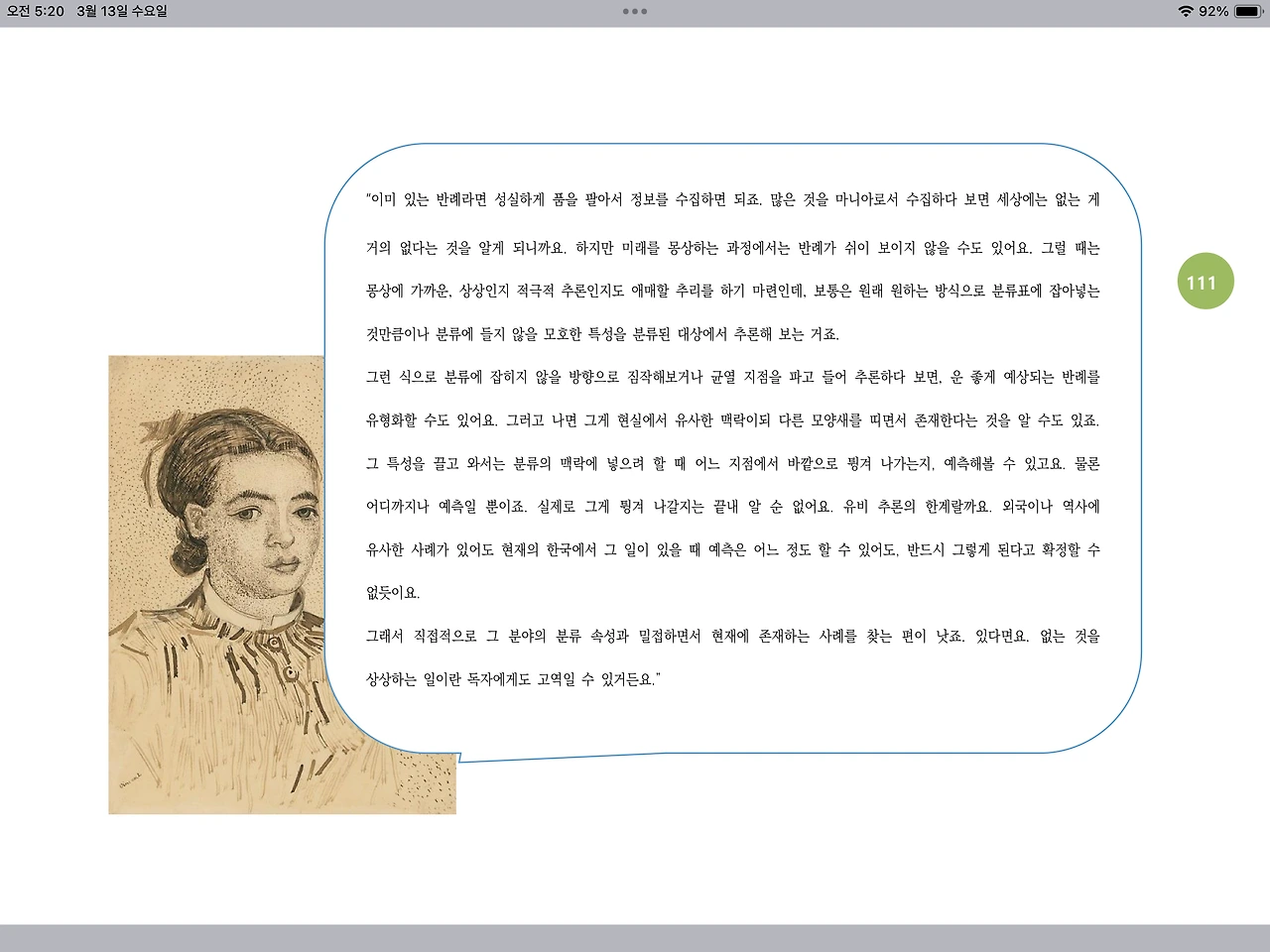 그래서 직접적으로 그 분야의 분류 속성과 밀접하면서 현재에 존재하는 사례를 찾는 편이 낫죠. 있다면요. 없는 것을 상상하는 일이란 독자에게도 고역일 수 있거든요.”