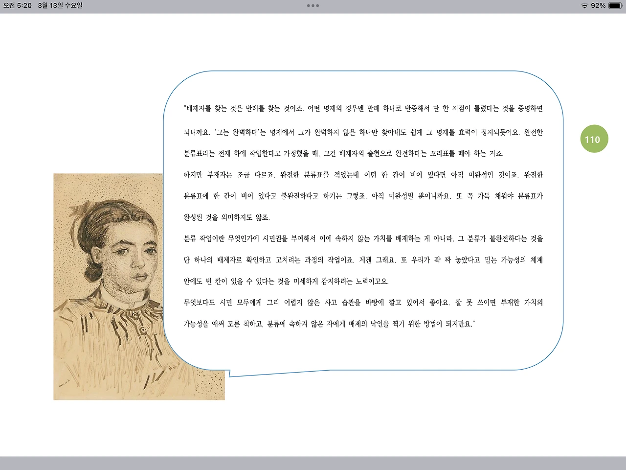 분류 작업이란 무엇인가에 시민권을 부여해서 이에 속하지 않는 가치를 배제하는 게 아니라, 그 분류가 불완전하다는 것을 단 하나의 배제자로 확인하고 고치려는 과정의 작업이죠. 제겐 그래요. 또 우리가 꽉 짜 놓았다고 믿는 가능성의 체계 안에도 빈 칸이 있을 수 있다는 것을 미세하게 감지하려는 노력이고요.