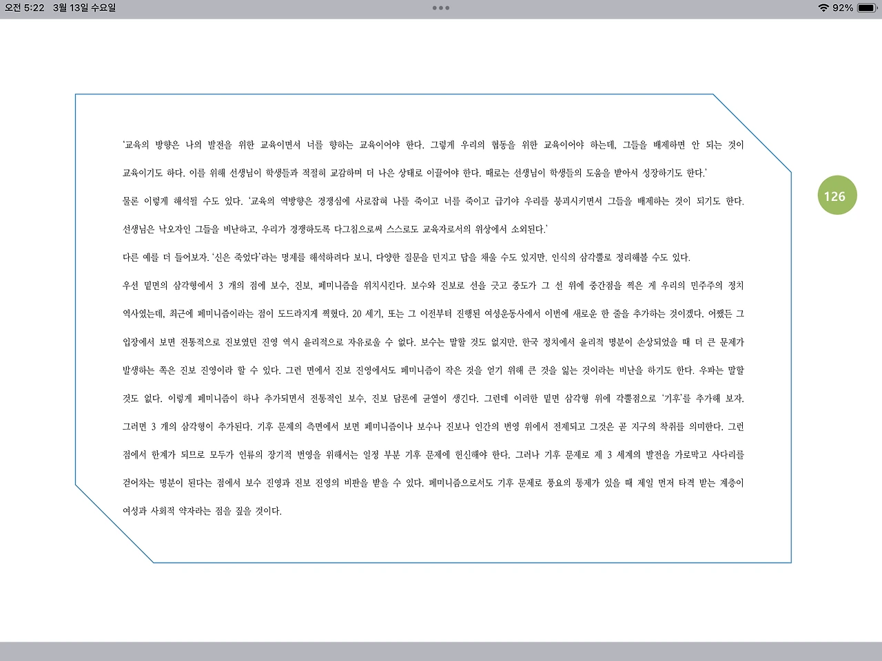 ‘교육의 방향은 나의 발전을 위한 교육이면서 너를 향하는 교육이어야 한다. 그렇게 우리의 협동을 위한 교육이어야 하는데, 그들을 배제하면 안 되는 것이 교육이기도 하다. 이를 위해 선생님이 학생들과 적절히 교감하며 더 나은 상태로 이끌어야 한다. 때로는 선생님이 학생들의 도움을 받아서 성장하기도 한다.’