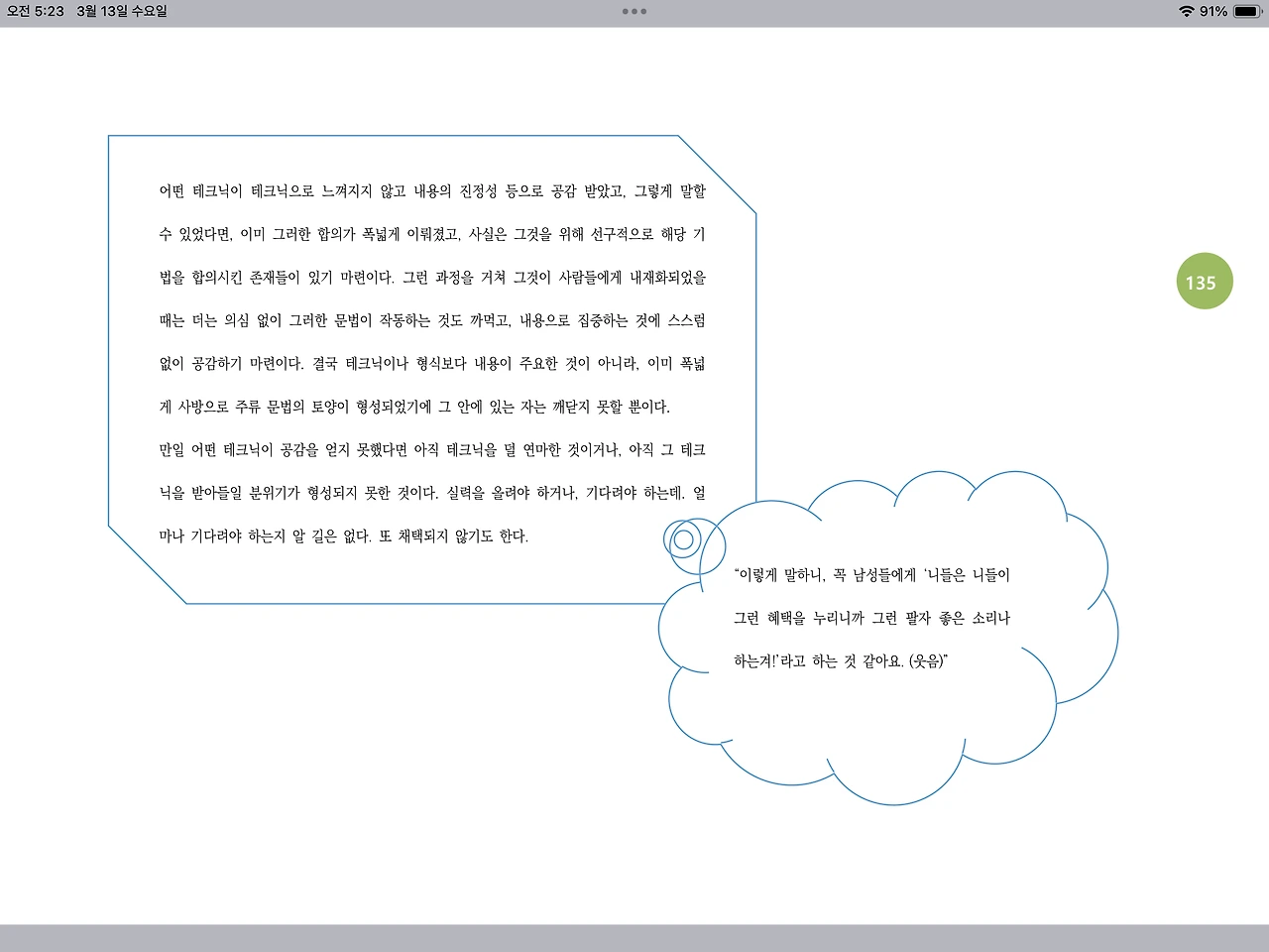 “이렇게 말하니, 꼭 남성들에게 ‘니들은 니들이 그런 혜택을 누리니까 그런 팔자 좋은 소리나 하는겨!’라고 하는 것 같아요. (웃음)”