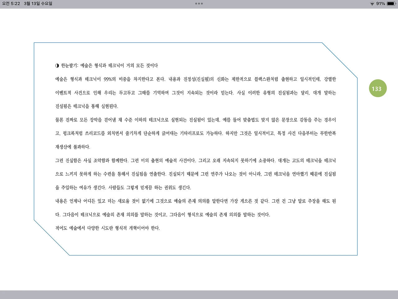 예술은 형식과 테크닉이 99%의 비중을 차지한다고 본다. 내용과 진정성(진실됨)의 신화는 제한적으로 블랙스완처럼 출현하고 일시적인데, 강렬한 이벤트적 사건으로 인해 우리는 두고두고 그때를 기억하며 그것이 지속되는 것이라 믿는다. 사실 이러한 유형의 진실됨과는 달리, 대개 말하는 진실됨은 테크닉을 통해 실현된다.