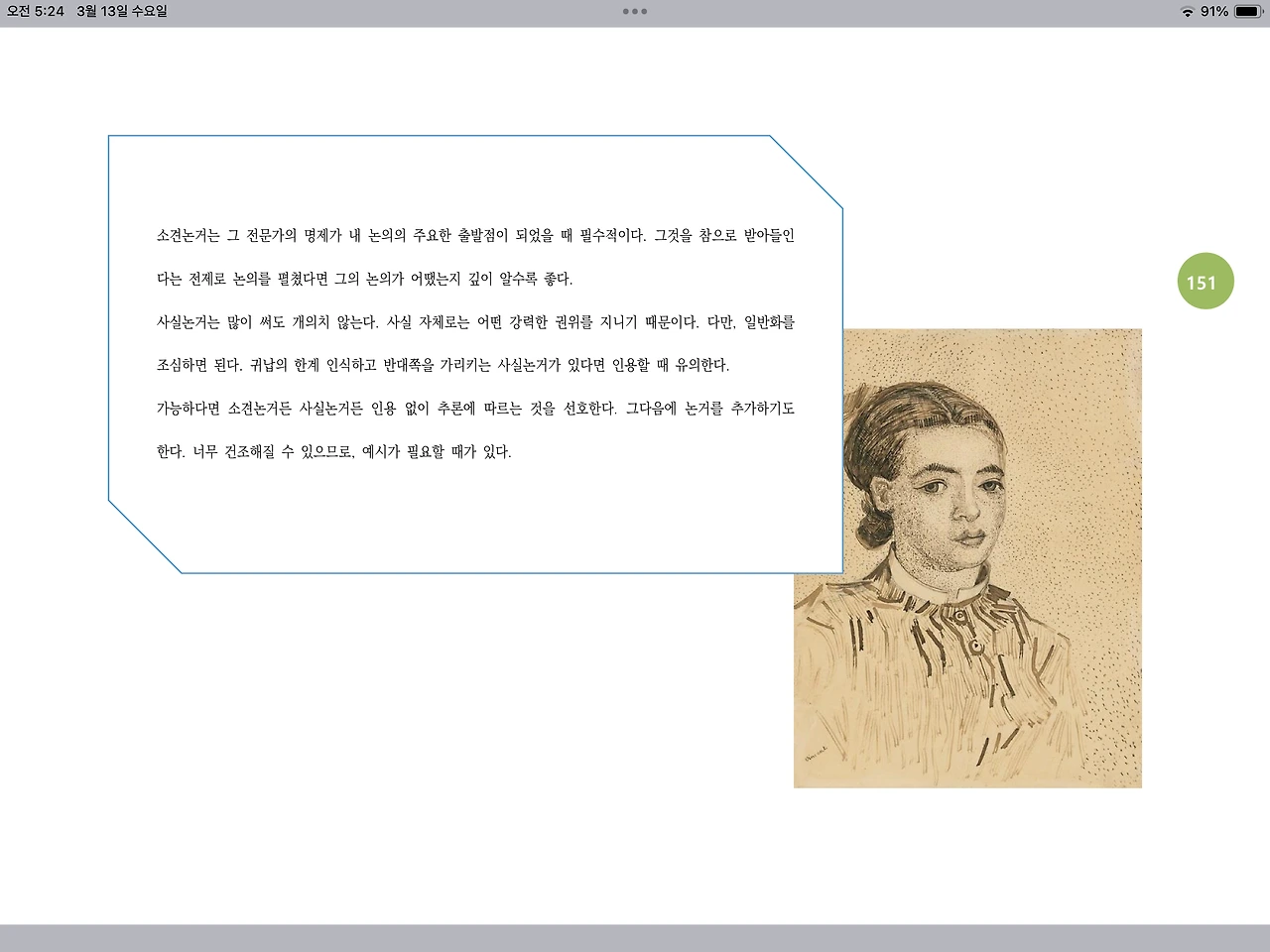 사실논거는 많이 써도 개의치 않는다. 사실 자체로는 어떤 강력한 권위를 지니기 때문이다. 다만, 일반화를 조심하면 된다. 귀납의 한계 인식하고 반대쪽을 가리키는 사실논거가 있다면 인용할 때 유의한다.