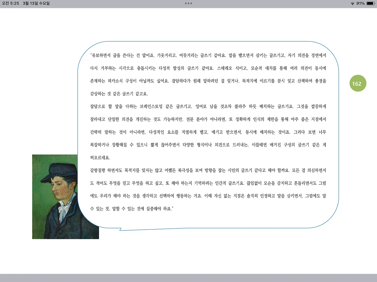 “유보하면서 글을 쓴다는 건 말이죠, 기웃거리고, 머뭇거리는 글쓰기 같아요. 말을 뱉으면서 삼키는 글쓰기고, 자기 의견을 정면에서 다시 거부하는 시각으로 충돌시키는 다성적 발성의 글쓰기 같아요. 스테레오 식이고, 모순적 대치를 통해 여러 의견이 동시에 존재하는 피카소식 구성이 아닐까도 싶어요. 잡담하다가 원래 말하려던 걸 잊거나, 목적지에 이르기를 잠시 잊고 산책하며 풍경을 감상하는 것 같은 글쓰기 같고요.