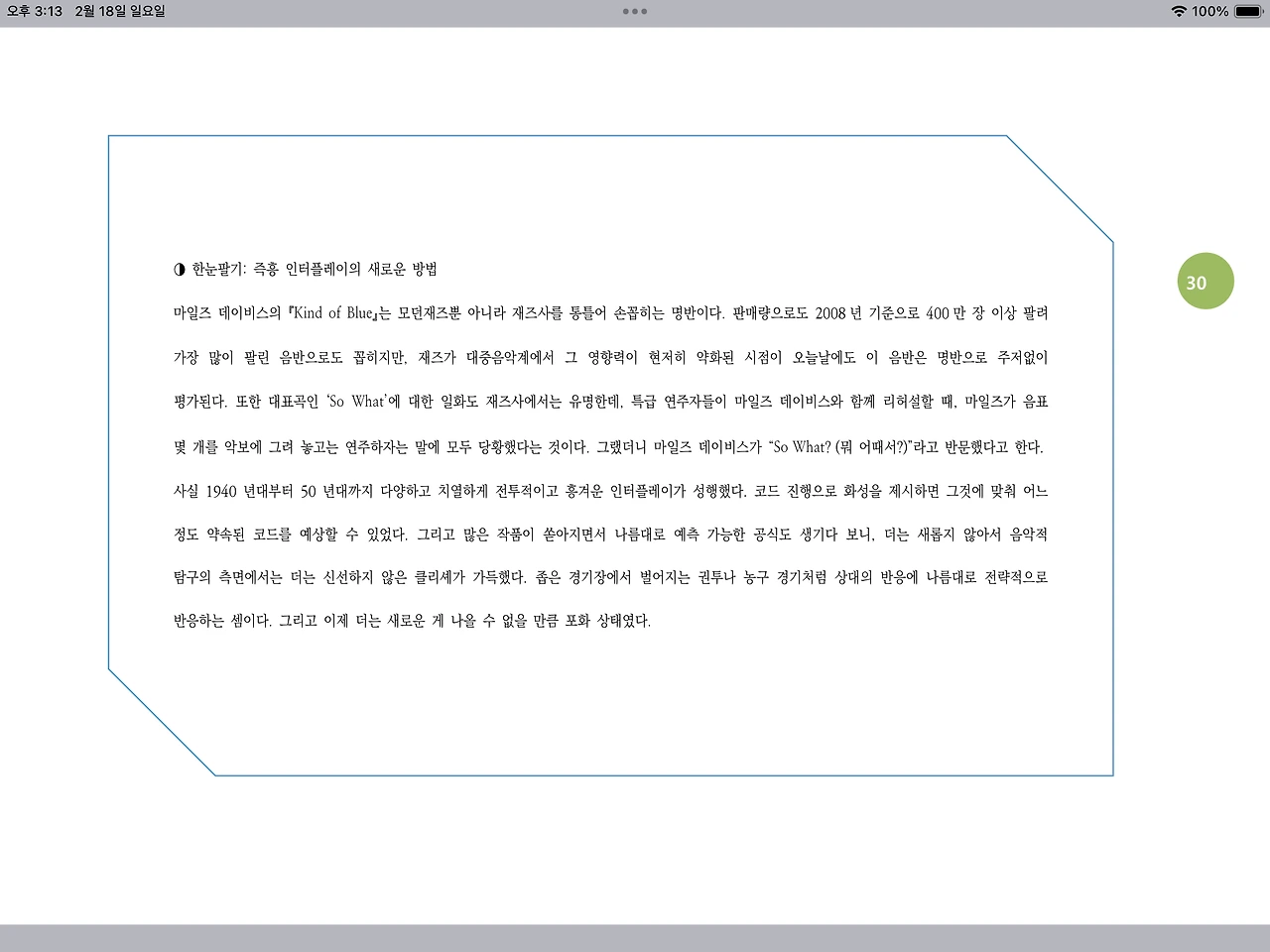 마일즈 데이비스의 『Kind of Blue』는 모던재즈뿐 아니라 재즈사를 통틀어 손꼽히는 명반이다. 판매량으로도 2008년 기준으로 400만 장 이상 팔려 가장 많이 팔린 재즈 음반으로도 꼽히지만, 재즈가 대중음악계에서 그 영향력이 현저히 약화된 시점인 오늘날에도 이 음반은 명반으로 주저없이 평가된다. 또한 대표곡인 ‘So What’에 대한 일화도 재즈사에서는 유명한데, 특급 연주자들이 마일즈 데이비스와 함께 리허설할 때, 마일즈가 음표 몇 개를 악보에 그려 놓고는 연주하자는 말에 모두 당황했다는 것이다. 그랬더니 마일즈 데이비스가 “So What? (뭐 어때서?)”라고 반문했다고 한다.